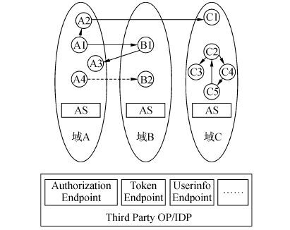 在图 1展示的跨域服务联合场景中,直接面向用户的服务A1需要使用外域服务以完成业务逻辑。由于业务流程分散在A、B、C三个域中,为统一用户管理,需要协商使用同一个OP/IDP(A、B、C三个域的IDP之一或第三方IDP)提供的身份认证服务,本文以选择第三方IDP为例进行描述。