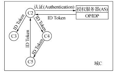 图 3展示了同域服务联合的典型场景,用户在使用服务C2时,C3、C4由于间接被调用而需要验证用户身份。引入2.1节的基于OIDC会话管理无疑可以解决问题,但基于同一安全域中各服务间基本的信任关系可以更简便地传递可验证的用户身份信息。域C使用本域中的OP/IDP进行用户的统一认证,用户首次访问C2服务时,C2引导用户前往本域的ODP处进行身份认证,在成功通过身份认证后获得ID Token;C2在之后请求C3、C4服务时携带该ID Token作为可认证用户身份标识;C3、C4接收到ID Token后,通过ID Token信息及其有效性验证结果即可获知用户身份及用户通过了身份认证这一事实。