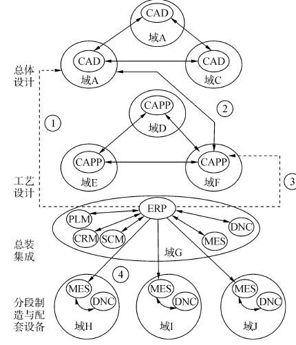 6) 域 G的ERP服务根据工艺设计图纸,调用自身的MES、DNC等服务(同域服务联合)和域 H、I、J的MES服务(对应步骤4),属跨域服务联合)实现装备的分段制造;