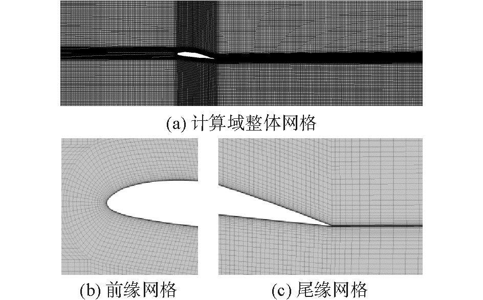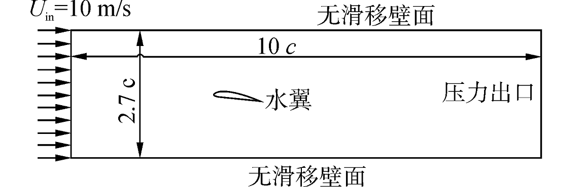 3 计算网格及边界条件计算采用弦长c=70 mm的Clark-Y 型水翼,图 1给出了计算区域及其边界条件。计算区域的入口距翼型前缘为4c,出口距翼型尾缘的距离为5c。为了保证壁面函数对无量纲y+值的要求,对翼型周围近壁面区域进行了网格加密,如图 2所示。