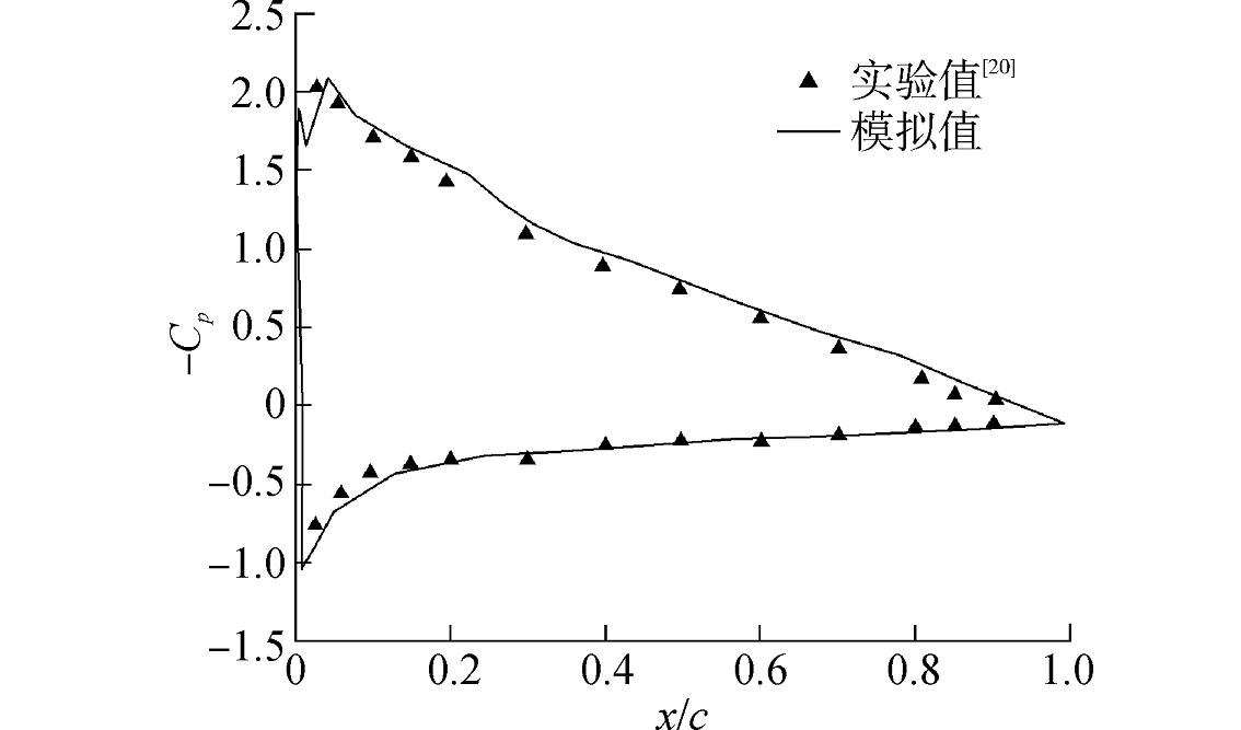 | 图3 水翼表面压力系数分布 Figure 3 Surface pressure coefficient of hydrofoil |