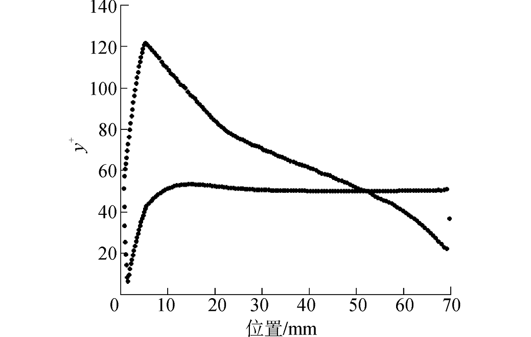 本文对计算域划分了4套不同尺寸的网格并作网格无关性验证,网格节点数分别为N1=69 226,N2=83 208,N3=105 588及N4=123 188。网格无关性验证结果如表 1所示,从表 1中可以看出,当网格数大于N3时,两种不同空化数条件下水翼的升阻力系数相对变化均小于1%,表明此时网格数量对计算结果的影响可以忽略。同时,网格数为N3时,翼型的升阻力系数与试验值误差均在5.5%以内。图 3、4分别为当空化数σ = 3.0时通过计算得到的翼型表面压力系数(-Cp)及无量纲y+值,从图中可以看出,压力系数计算值与实验值吻合较好且翼型表面网格的y+大部分在30~90,满足壁面函数对近壁面区域网格的要求。因此,最终选择网格3作为本文的计算网格。