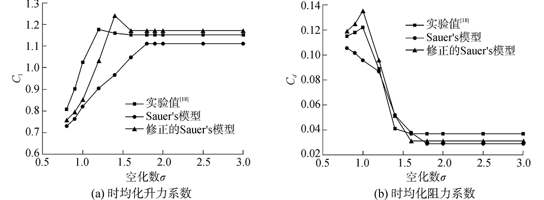为研究在不同程度空化条件下,采用修正后的Schnerr-Sauer 模型及涡黏度系数修正的SST k-ω 湍流模型的联合求解能力。本文通过数值计算的方法得到了原始Schnerr-Sauer模型及修正后的Schnerr-Sauer模型在多种空化数条件下水翼的升阻力系数,并与已有文献中的实验结果作对比分析,结果如图 5所示。由于空化是一种包含相变的瞬时物理现象,本文所有计算均为非定常,时间步长设置为Δt=1×10-4 s,总迭代步数设置为2 000,取最后8个周期内升阻力系数的平均值作为时均化后的计算结果。定义空化数σ,升力系数Cl及阻力系数Cd分别为