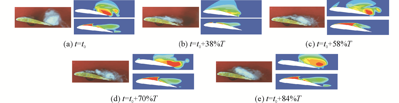 云状空化一个周期内演化主要分为以下几个阶段:1) 在t=t0时刻,翼型前缘处片状空穴几乎消失,尾缘处空泡开始逐渐脱离翼型壁面,从图中可以看到,原始的Schnerr-Sauer模型模拟得到的空穴形态与实验结果相差较大,而修正后的Schnerr-Sauer模型的缺陷是无法模拟出此时翼型前缘处的少许片状空穴,但能较好地模拟尾缘处逐渐脱离翼型表面的空泡团;2) 在t=t0+38%T时刻,附着于翼型表面的片状空穴发展至最大长度且尾缘处的空泡团消失,修正后的Schnerr-Sauer模型模拟的空穴长度与实验结果吻合较好,而原始的Schnerr-Sauer模型无法准确模拟此时的片状空穴形态;3) 在t=t0+70%T时刻,翼型尾缘处的空泡团逐渐脱落并向下游移动,对比发现,修正后的Schnerr-Sauer模型能够捕捉到尾缘处脱落的空泡,而原始的Schnerr-Sauer模型捕获这一细节的能力欠佳;4) 在t=t0+84%T时刻,翼型前缘的片状空穴又开始逐渐回缩,尾缘处的大体积空泡团逐渐形成,开始重复t=t0时刻空泡形态特征。