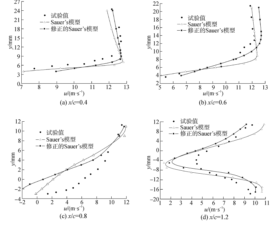 4.2.2 云空化水平速度分布特性为了揭示云空化流场的运动特性,研究了流场内四个不同位置(x/c =0.4、 x/c =0.6、 x/c =0.8和x/c =1.2,其中x为水平方向到水翼前缘的距离,y为垂直方向到水翼表面的距离)上的水平速度分布,结果如图 7所示。整体上看,与原始的Schnerr-Sauer模型相比,采用修正后的Schnerr-Sauer模型计算得到的时均水平分速度与实验值吻合程度更好。