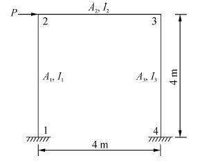 如图2所示单层刚架,其极限状态方程为Z=0.01-u3(A1,A2,P)=0,其中u3=(48k+32)P/((18k+3)EI1),k=I2/I1为顶点3的水平位移(单位为m),柱和梁的横截面积A1、A2为对数正态分布的随机变量,荷载P服从极值I型分布,其统计参数见表1。弹性模量E=2.0×106 kN/m2,梁柱截面惯性矩分别为I1=A12/12、I2=A22/6。