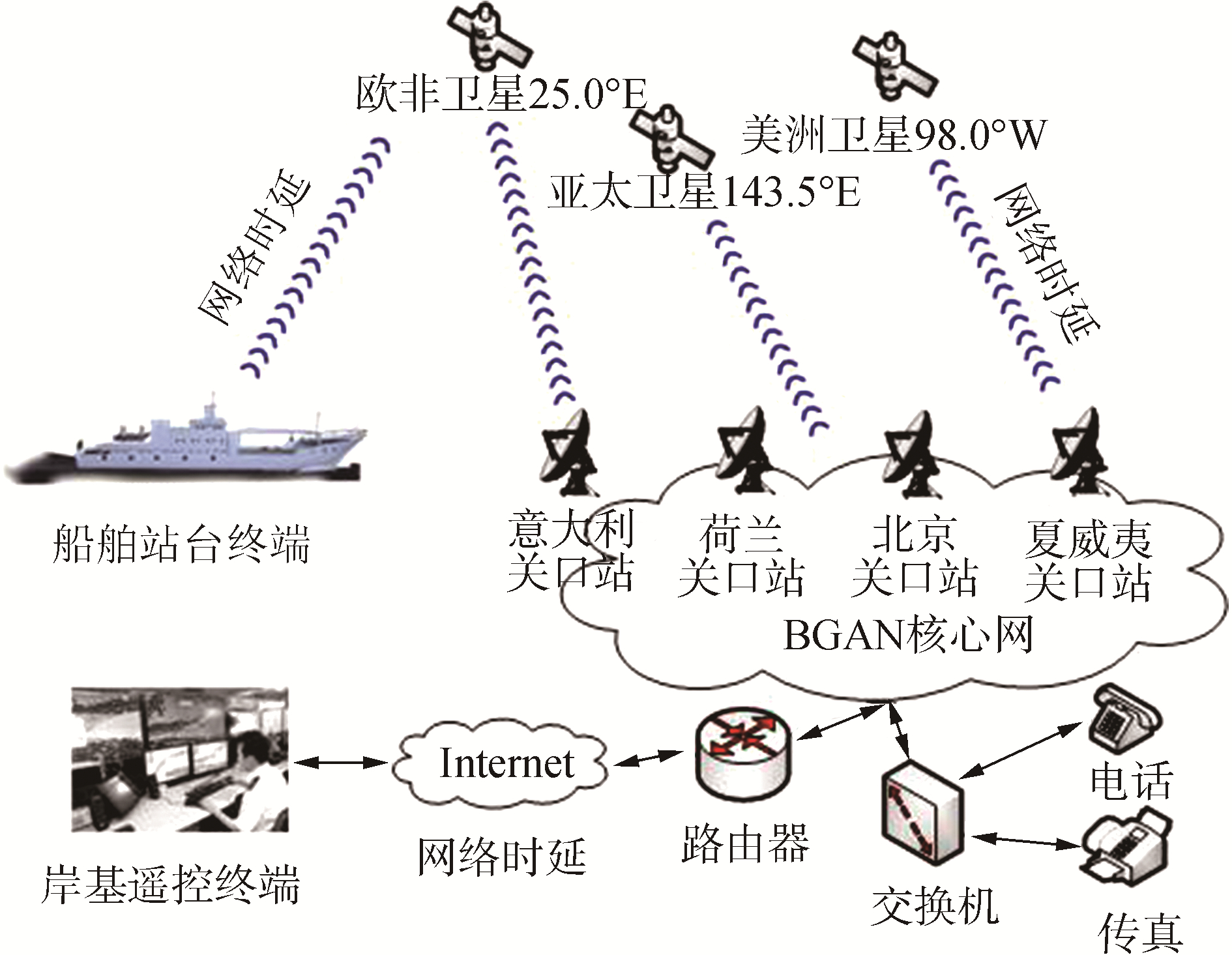 1 问题描述海事卫星是集全球海上常规通信、遇险与安全通信、特殊与战备通信于一体的实用性高科技产物。海事卫星已升级到符合3G标准的第四代系统,全面兼容WCDMA 3G标准。Inmarsat公司是目前唯一提供全球范围内卫星移动通信的运营商,推出了先进通信功能的宽带全球区域网络(broadband global area network, BGAN) 系统。图 1给出了基于BGAN网络的船舶远程遥控逻辑结构图。