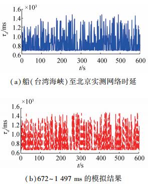图 2(a)给出了表 1中船舶在台湾海峡时至北京的网络时延实际测试结果,图 2(b)给出了该仿真实验中对672~1 497 ms不确定时延的模拟结果。通过对比可知,仿真实验中对不确定时延的模拟与实测时延非常相近。通过以上模拟构建卫星通信网络环境以对本文所提算法进行测试,具有一定的可信性。