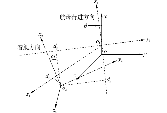 1 舰载机纵向动力学模型本文涉及的相关坐标系定义如图 1所示[7-8]。图 1中:oxyz为大地坐标系,原点o为航母初始位置,x方向指向北方,y方向指向东方,z方向垂直于海平面向下;o1x1y1z1为航母本体系,原点o1为航母摇摆中心,x1方向为航母行进方向,y1方向指向航母右舷,z1方向垂直向下;o2x2y2z2为着舰坐标系,原点为舰载机的理想着舰点(甲板面第2、3道阻拦索中间位置),x2方向为垂直于阻拦索向前,y2方向平行于阻拦索向右,z2方向垂直与甲板面向下。在上图中,ω为斜角甲板与航母行进方向夹角,dx、dy和dz分别为理想着舰点在航母本体系中的坐标值。