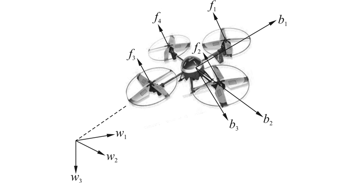 2 四旋翼无人机模型本文研究的四旋翼无人机结构如图 2所示。图中:{w1,w2,w3}为惯性参考坐标系;{b1,b2,b3}为机体参考坐标系。b1,b2位于四个旋翼中心确定的平面内,分别与四旋翼无人机的两轴重合,设b1为机头方向。第三轴b3与b1,b2满足右手定则。