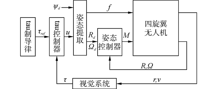 由于四旋翼无人机自身欠驱动的动力学特点,四旋翼无人机的平移运动需通过改变姿态来实现,且系统转动运动的状态量相对于平移运动是相对独立的,可进行解耦,分别设计用于控制位置的tau控制器和姿态控制器,即飞行器控制中常用的内外姿态控制+外环质心控制的控制系统结构[19]。本文所设计的控制系统结构如图 3所示。