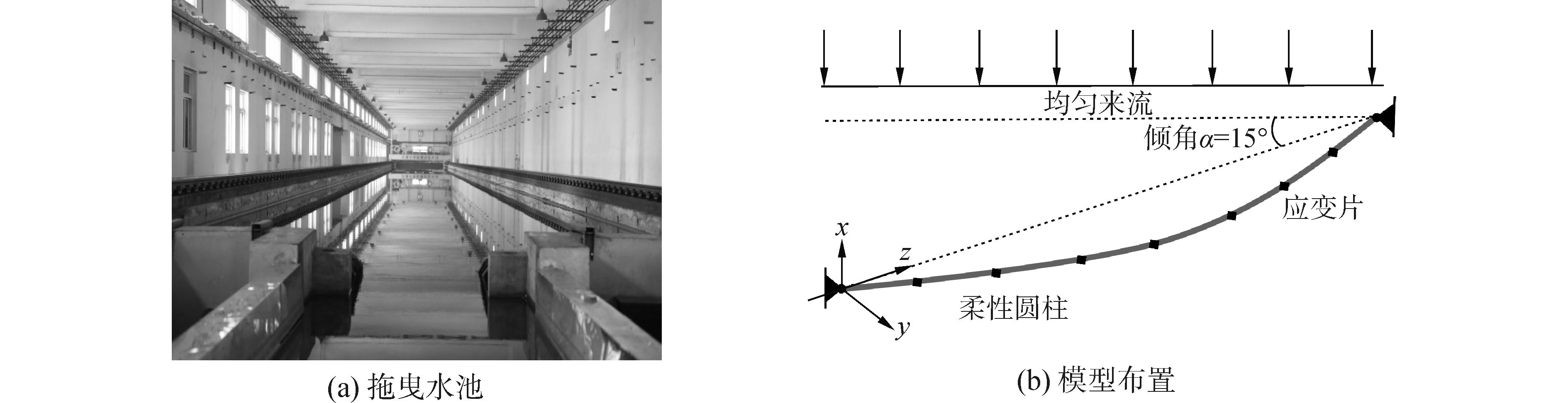 1 小倾角柔性圆柱VIV实验实验在天津大学水利工程仿真与安全国家重点实验室的拖曳水池中完成。图 1为实验水池及装置示意图。拖曳水池长137.0 m,宽7.0 m,深3.3 m,柔性圆柱模型通过万向节安装在与拖车相连钢架上,圆柱结构轴向力为500 N。调整钢架和拖车的相对位置可实现垂直来流条件和15°倾角来流条件。实验中拖车速度范围为0.05~1.00 m/s,间隔为0.05 m/s,雷诺数范围近似800~16 000。拖车采用模拟控制和数字控制两套系统,可保证速度精度为0.1%,如图 1所示。