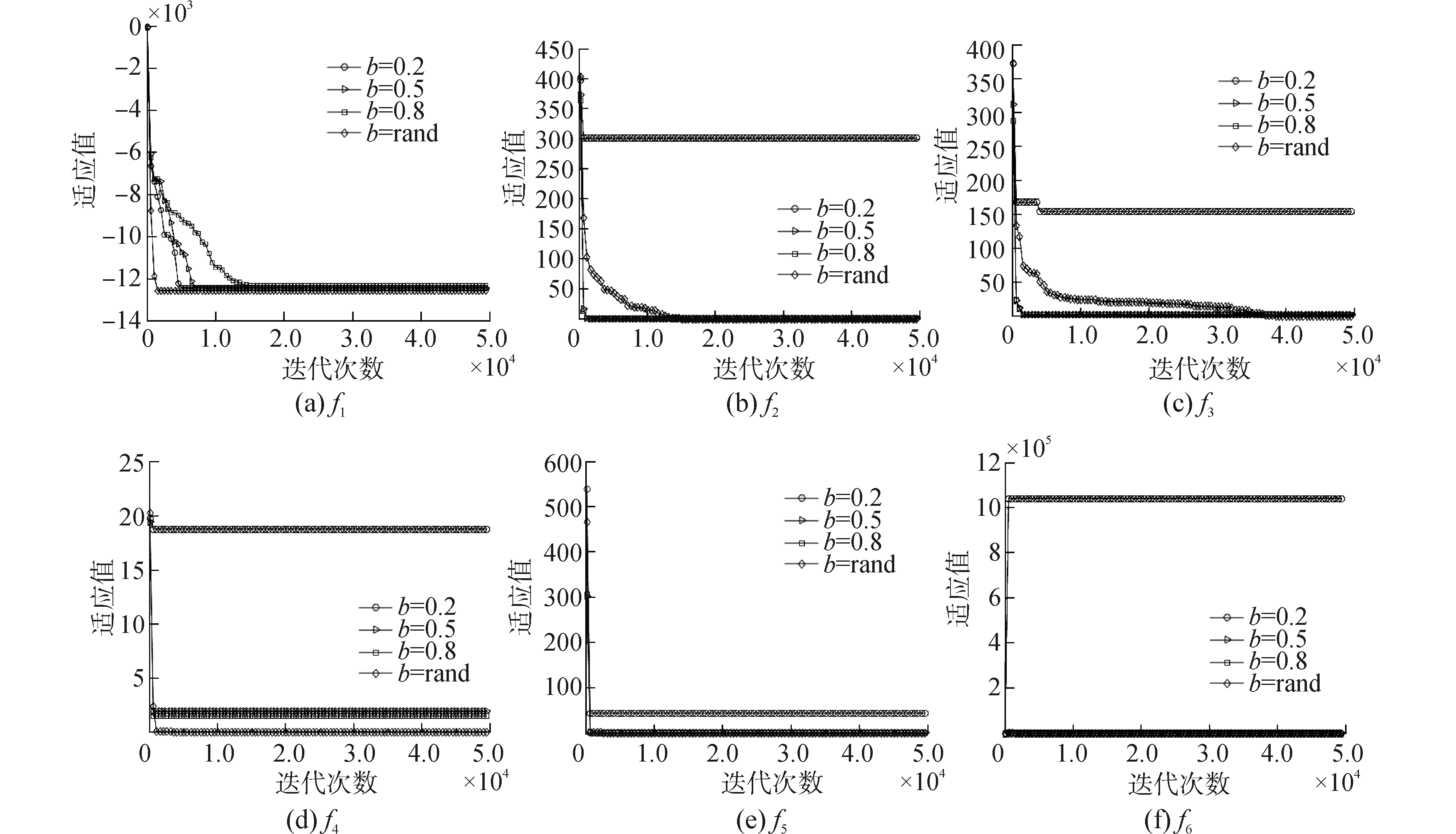 4.1.1 算法参数的影响在式 (5) 中引入变异参数b。当参数b取不同值时的测试结果如表 2所示。由表 2可知当b=rand (0,1) 时,既增加了寻优方向的随机性和多样性,又很好的解决了陷入局部最优的问题。图 1给出6个函数在不同变异参数b下的优化曲线。