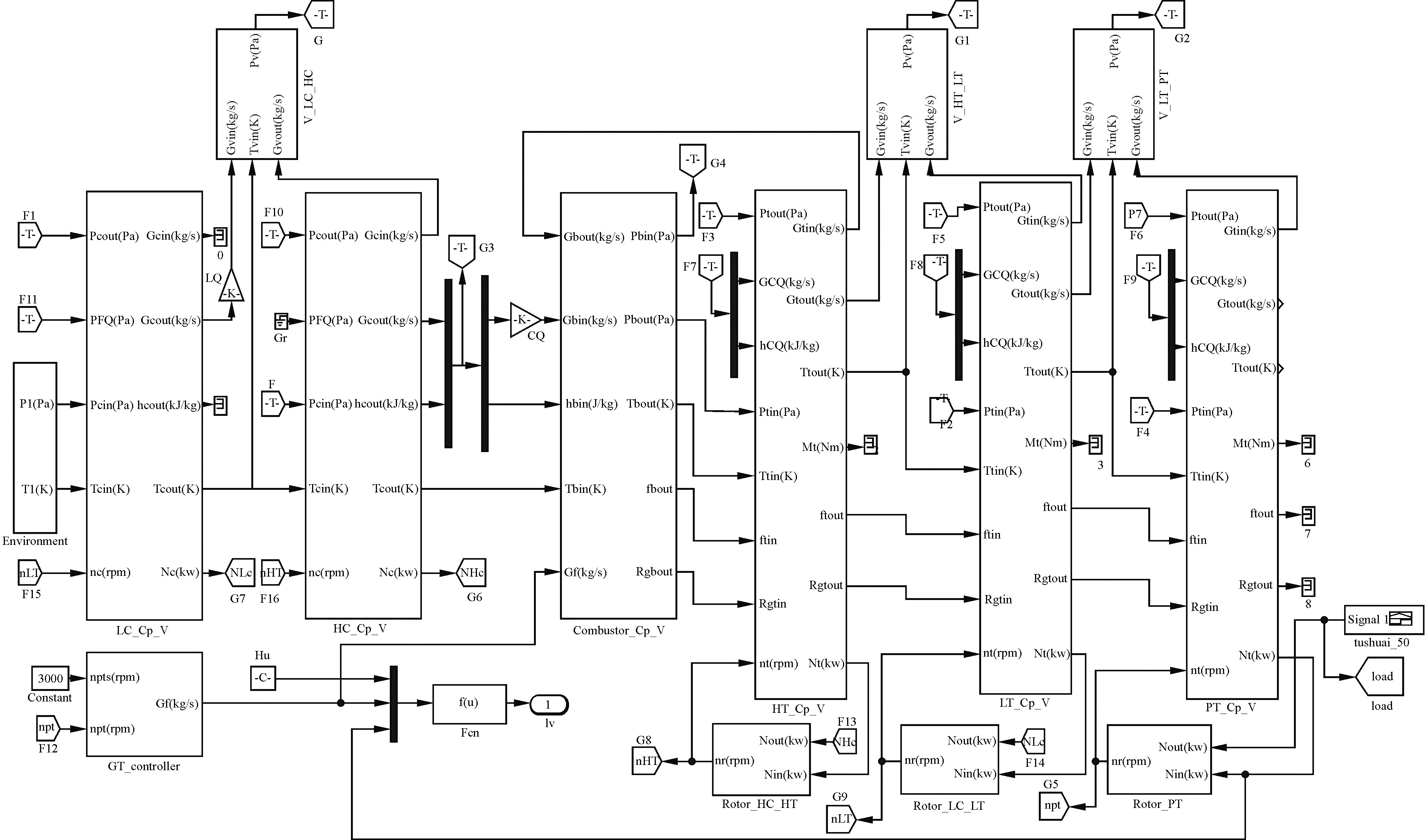 综合考虑仿真精度、工程计算量等因素,本文选择商品化一维HARIKA计算程序(Fortran语言开发)计算三轴燃机低压压气机特性线数据,并将其嵌入到如图 2所示的基于容积惯性法开发的零维系统仿真模型(Simulink环境开发)中,其中LC_Cp_V、HC_Cp_V、Combustor_Cp_V、HT_Cp_V、LT_Cp_V、PT_Cp_V、GT_controller、V_LC_HC、Rotor_HC_HT分别为低压压气机模块、高压压气机模块、燃烧室模块、高压涡轮模块、低压涡轮模块、动力涡轮模块、调速器模块、低压/高压压气机容积模块、高压转子模块,燃机负载为理想化电力负载。