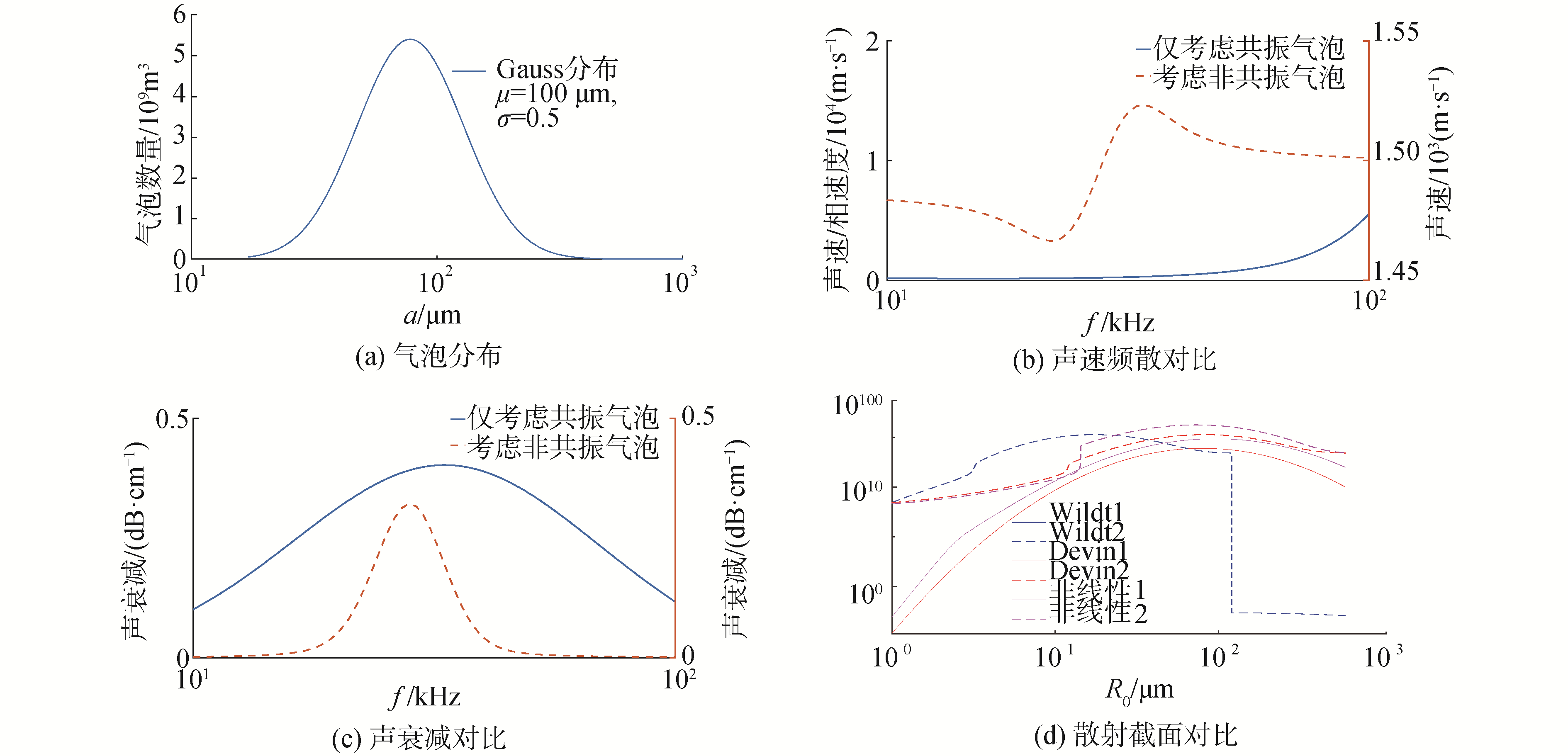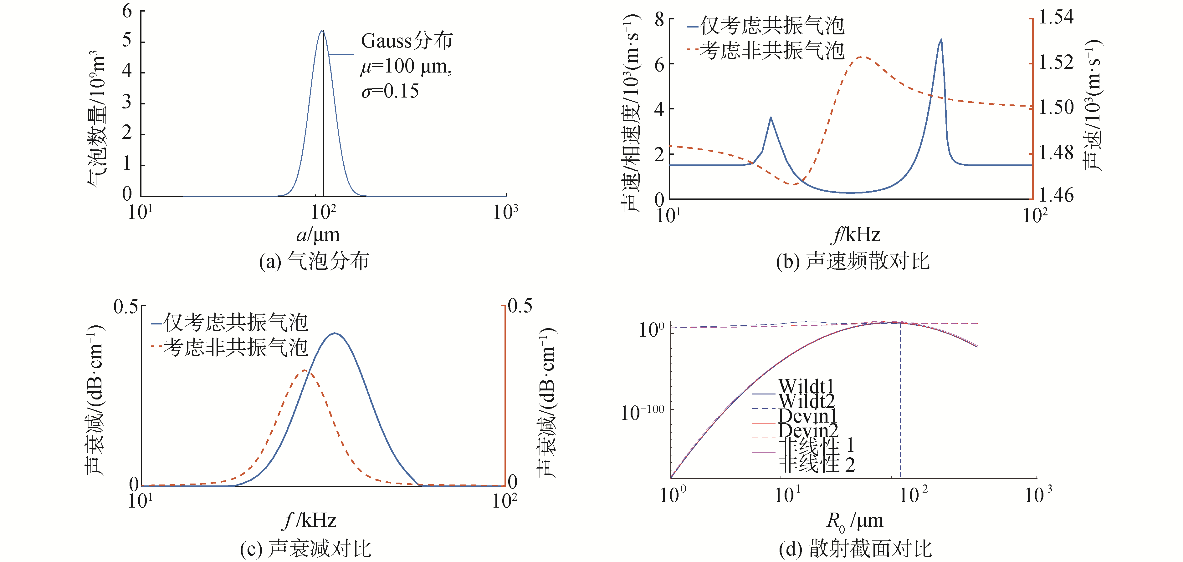 在医用超声生理组织成像、工业材料和设备无损评估、水声参量阵等领域,含气泡介质都有着广泛的应用。其中,气泡尺寸分布的声学测量与反演是获取气泡群物理参数,进而对应用效果进行定量化分析评估的重要环节。目前,气泡群尺寸分布参数的声学测量与反演方法按测量方式分为被动测量法和主动测量法。Leighton[1]提出被动测量法,即通过测量海水中破碎波产生的气泡向外辐射的声压信号,再通过时频分析获得气泡半径分布及对应的气泡数量。该方法受信噪比的影响较大,低信噪比时经常无法检测到信号,导致得到的分布结果不够准确。主动测量法利用发射声信号,经过气泡层后,接收到的声学数据,再利用物理模型进行反演,进而得到气泡的分布情况。其中测量方法主要是基于气泡共振响应获取相关参数,如Terril[2-3]和Matthieu Cavaro[4]通过测量声速进而反演气泡参数,Medwin等[5-9]提出的脉冲回声法和连续波法,Vagle等[10]提出的回声测深方法结合声逆散射方法等。此外还有基于衰减量反演气泡分布的经典方法,如Clay和Medwin[11-12]共同提出的共振估计理论,其假设外部激励仅受与其发生频率共振的半径的气泡的影响,不考虑液体的粘滞和热传导并认为阻尼系数为一个常数,进而化简了声衰减的积分公式。Commander[13-14]提出的有限元法化简了声衰减积分公式。Caruthers[15]提出的迭代法对共振估计法进行模拟和修正等。在气泡振动与声学特性的理论研究方面,Minnaert[16]忽略了气泡表面张力和介质中粘滞阻力的影响,最早推导出气泡的共振频率公式。国内的钱祖文等[17-18]对人工产生的气幕及海洋中的气泡进行了大量研究,运用声学测量手段对气泡幕和尾迹气泡群的尺寸分布和气体体积分数进行了反演,并建立了相关的参数模型。综合已有的研究方法可以看出,用声学方法研究气泡分布主要依托于含气泡介质中气泡群的声学参数,即声散射特性,如气泡对声速频散、声衰减、声散射截面[19]等的影响特性。将气泡对水介质物理特性影响的规律加以修正,即可用来粗略地反演含气泡海水介质中相关的气泡参数。线性方法基于共振估计法,计算线性散射截面或衰减截面进而反演气泡相关参数[20-21],对共振态气泡较为敏感,而对非共振态气泡分析的精度不高,常会出现频率模糊问题,使分析结果出现偏差甚至错误。非共振气泡对声散射特性的影响程度、进而对气泡尺寸分布反演结果的影响程度,是本文讨论的重点。