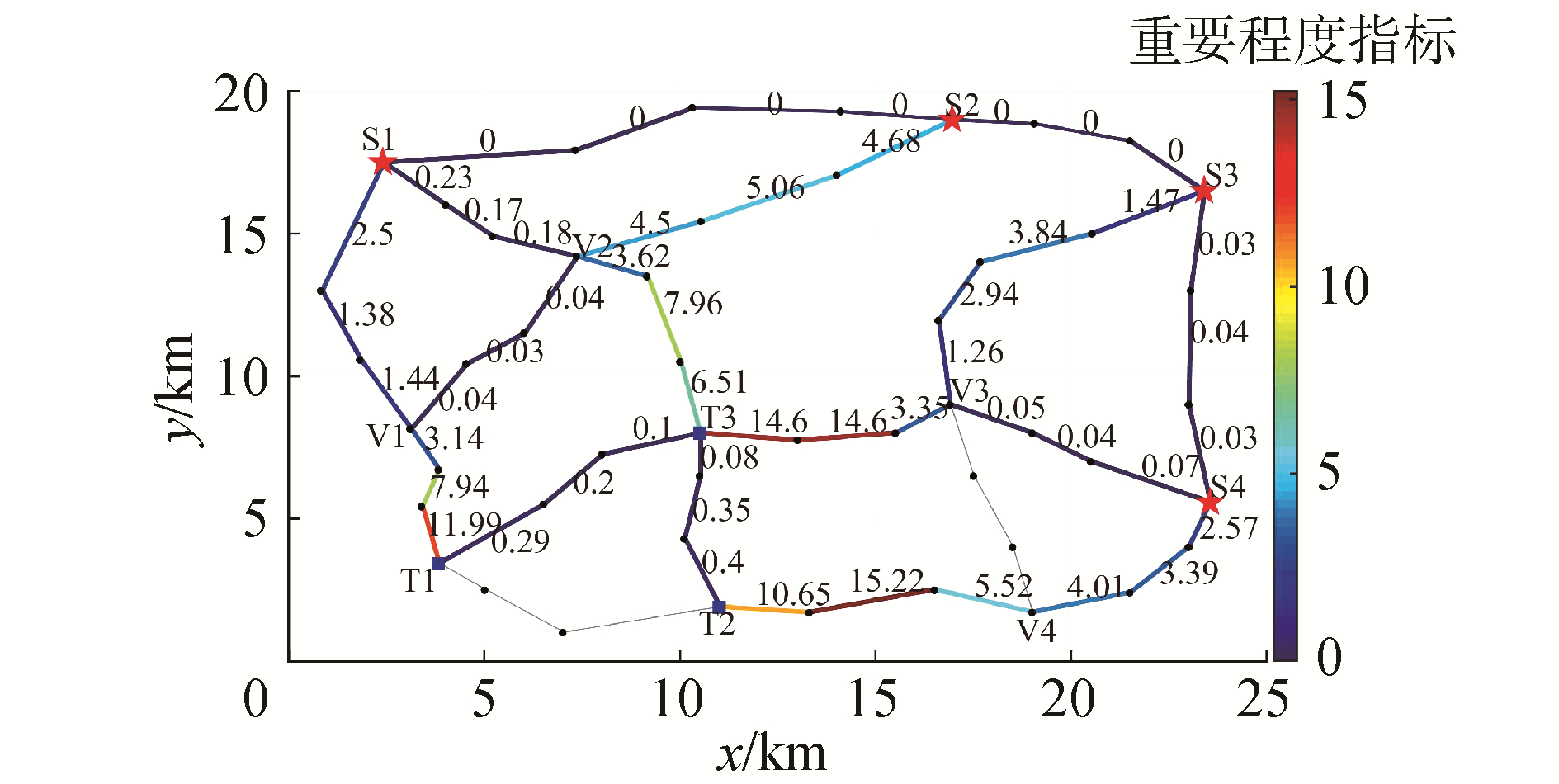 考虑对桥梁进行抗震加固,图 3绘制了震后恢复期t为1 d时各路段抗震加固重要程度指标,为无量纲数值。图中非桥梁节点之间的路径共有18条,如路径S1~V1、路径V1~T1,以路径作为抗震加固的选择单元,将这些路径上的重要程度指标相加,按照路径重要程度指标之和进行路径重要性排序,如表 4所示,并制定加固策略及计算相应经济投入,如表 5所示。