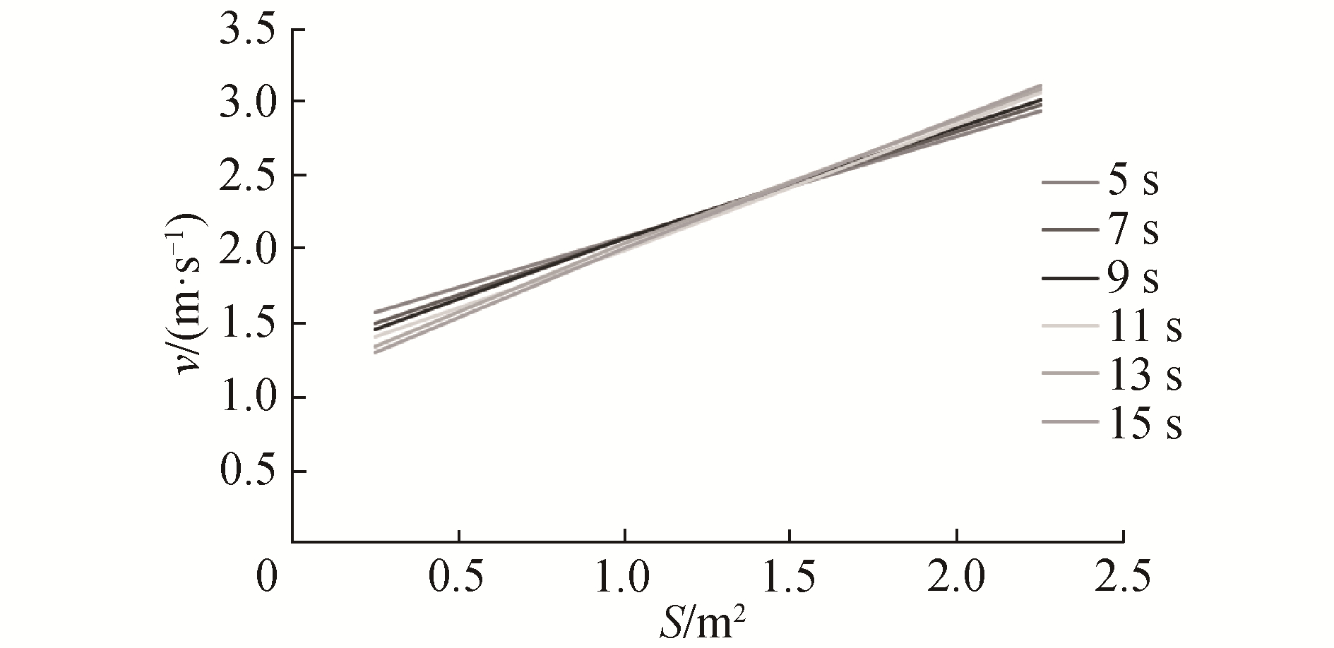 为定量得到破口面积与进水速度的关系,统计前5、7、9、11、13、15 s内的速度。以破口面积为横坐标、进水速度为纵坐标,做出不同时间的速度随破口面积的变化曲线(2 m×2 m模型计算精度较差,不做统计)。如图 12。