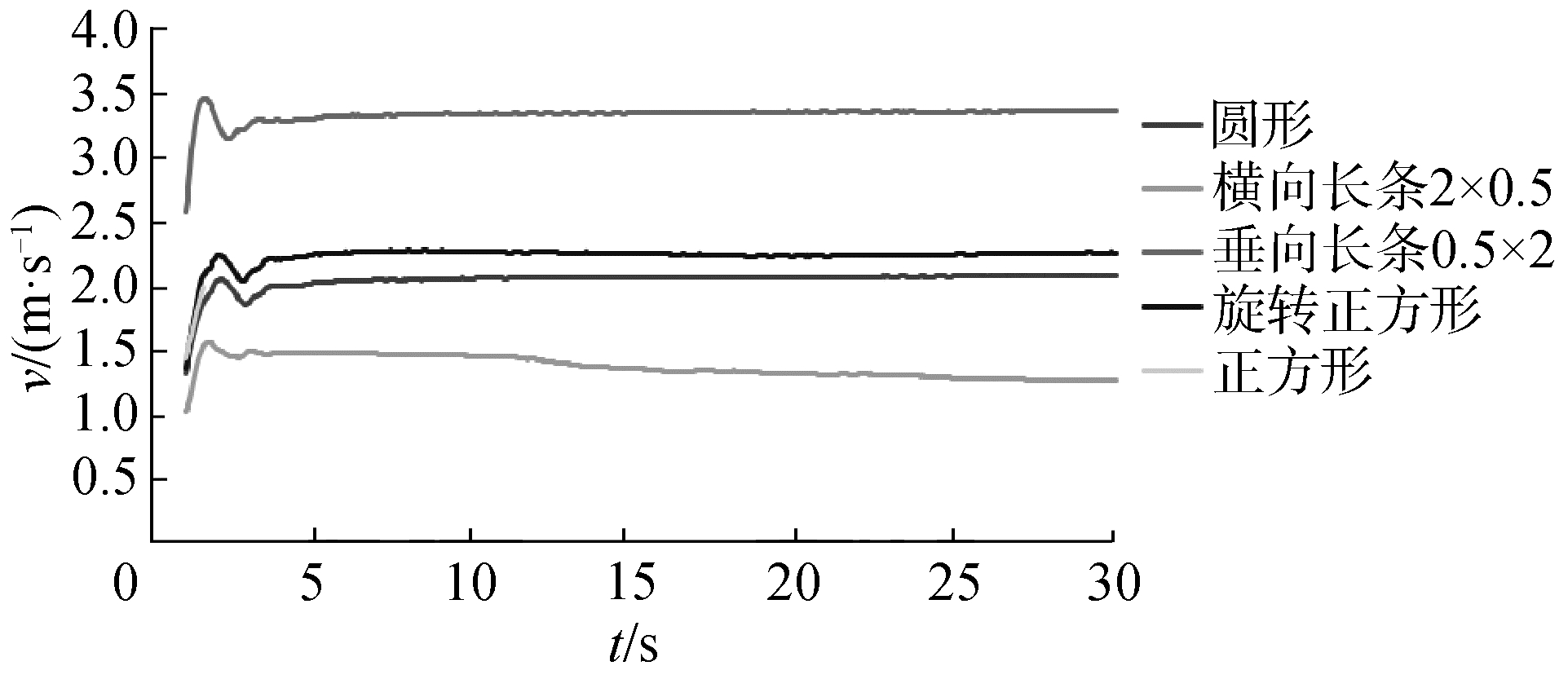 3.3 破口形状计算各个时刻的平均进水速度作图如图 15。所有模型的进水速度变化趋势相同,速度值不同,进水速度由高至低分别为:垂向长条破口、旋转正方形、正方形、圆形破口、最小的为横向长条破口。最终平稳速度分别为3.35、2.23、2.06、1.94、1.31。