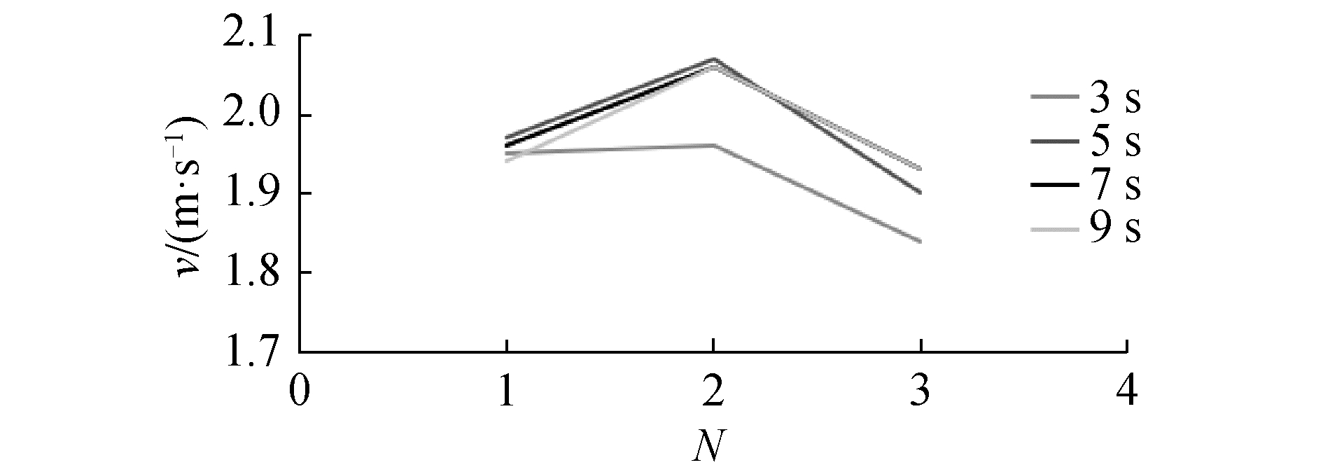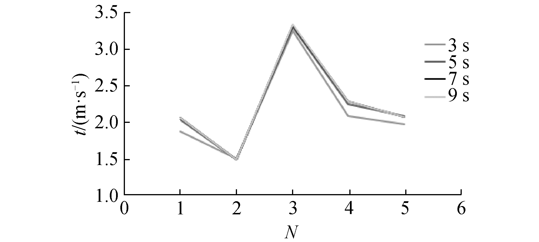 统计不同模型前3、5、7、9 s内的平均速度值,以模型序号为横坐标、速度值为纵坐标,定性分析不同时间节点处进水速度随破口位置的变化情况如图 18。