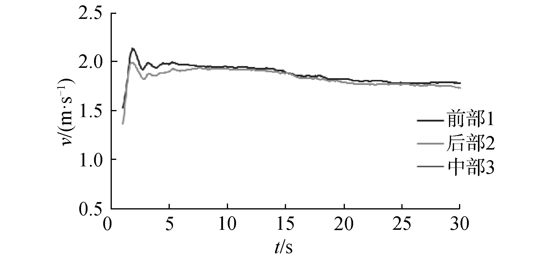 5 s后速度值趋于稳定,舯部速度最大,艏部和艉部模型速度值相近,呈对称形状分布。