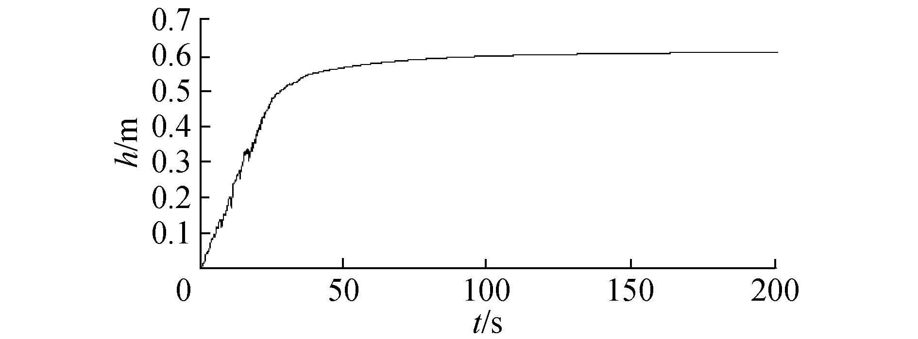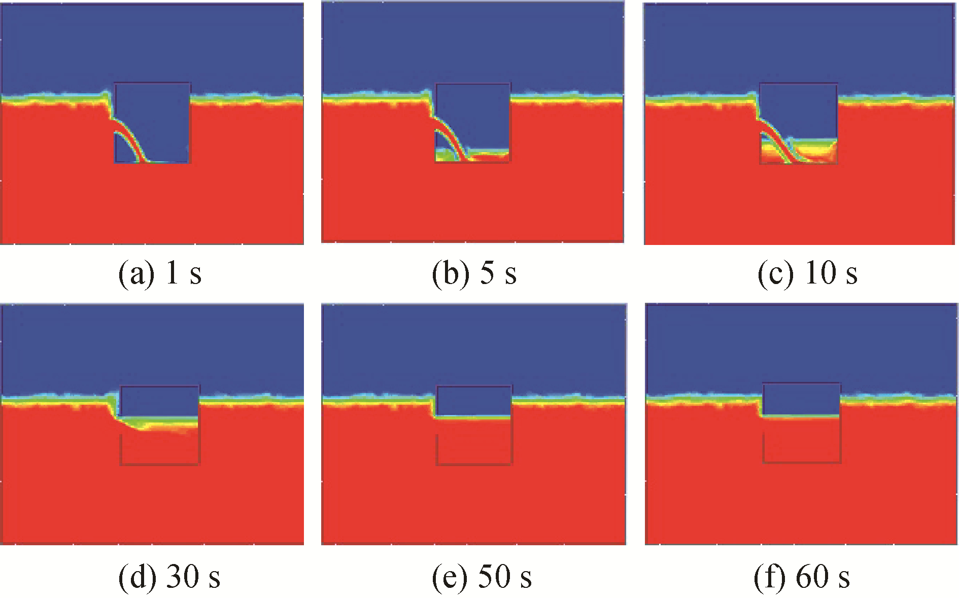 由图 6可知,前40 s水位上升较快,随后水位上升缓慢最后趋于稳定。20 s之前水位有小幅波动。20 s之前进水量较少,未形成相对平稳的水面,舱内水面波动较剧烈;随着进水的持续,舱内形成较平缓水面,进水对舱内水面的波动较小,水位平缓上升。本模型进水量为600 kg,进水高度为0.6 m。而外界水位高度为0.8 m。进水高度未达到外流域水位,舱内存在空气垫阻止了进水过程。