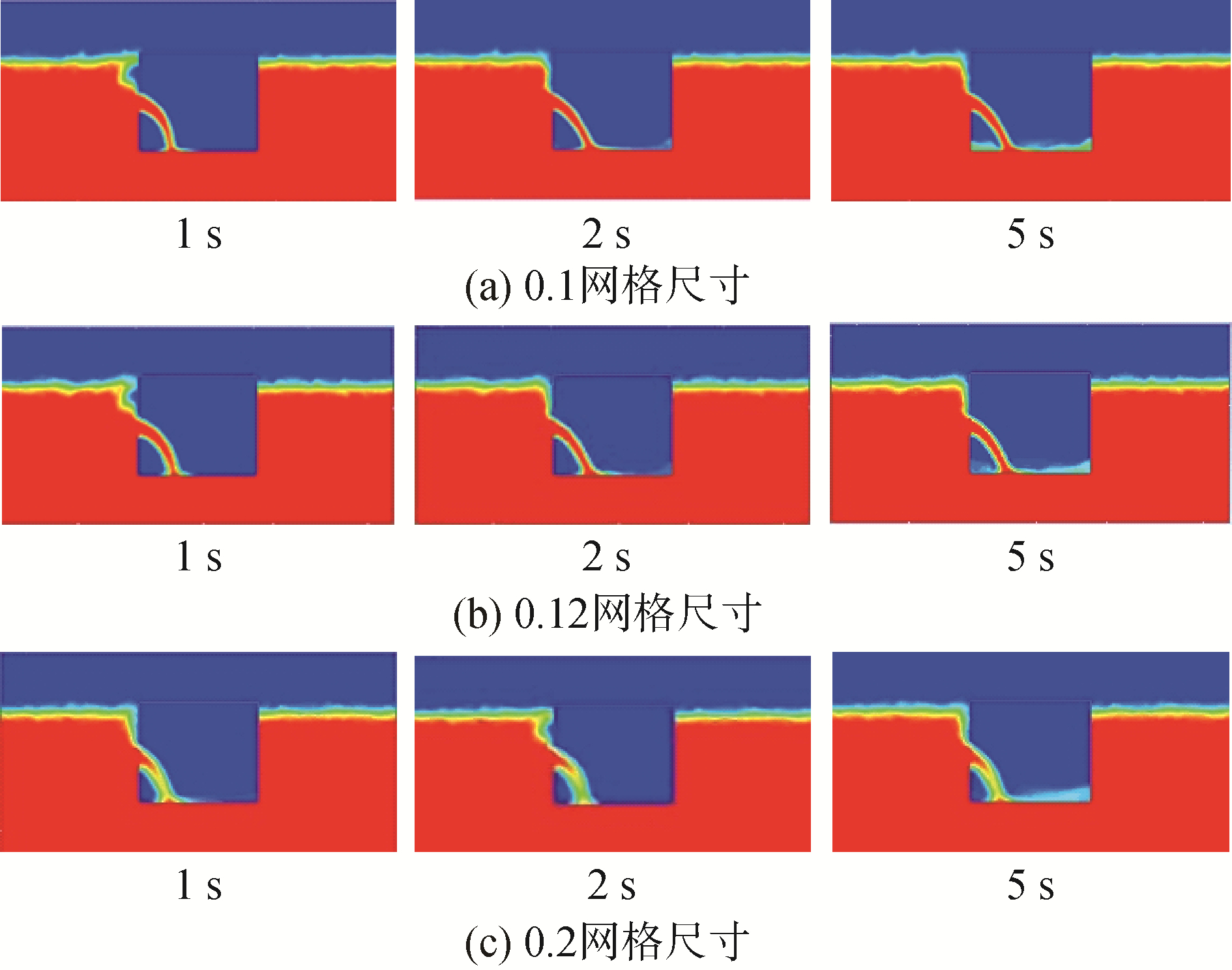 船舱吃水为4.5 m,设置破口处截面进行观察。1、5、10 s不同网格尺寸的相位分布如图 7。
