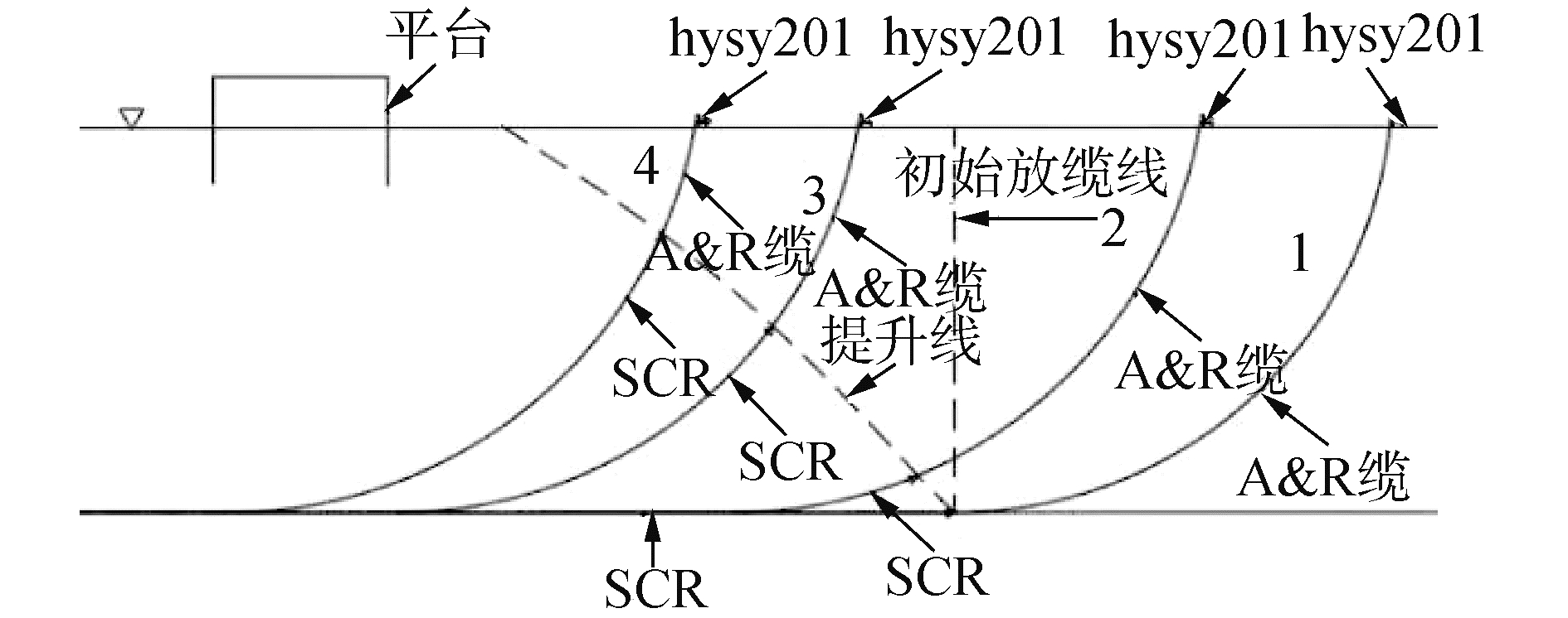 1 钢悬链线立管舷侧安装作业 1.1 钢悬链线立管舷侧安装作业流程钢悬链线立管布放一般可分为铺管——提管——移管3个过程[12],其中提管过程是钢悬链线立管舷侧安装的主要过程,本文依托陵水17-2工程项目开展6"钢悬链线立管舷侧安装过程动力学仿真及耦合分析研究,本文以“海洋石油201”作为安装船进行钢悬链线立管的安装作业。立管提升作业如图 1所示,提管过程首先需要“海洋石油201”船到达海床上的钢悬链线立管首端所在位置,通过舷侧系统垂直下放A & R缆连接海床上钢悬链线立管,然后继续下放A & R缆并驶离平台至安全距离后,向平台方向靠近,通过舷侧的管道回收系统回收A & R缆,将海床处的钢悬链线立管逐渐提升,直至“海洋石油201”船行驶至目标位置。