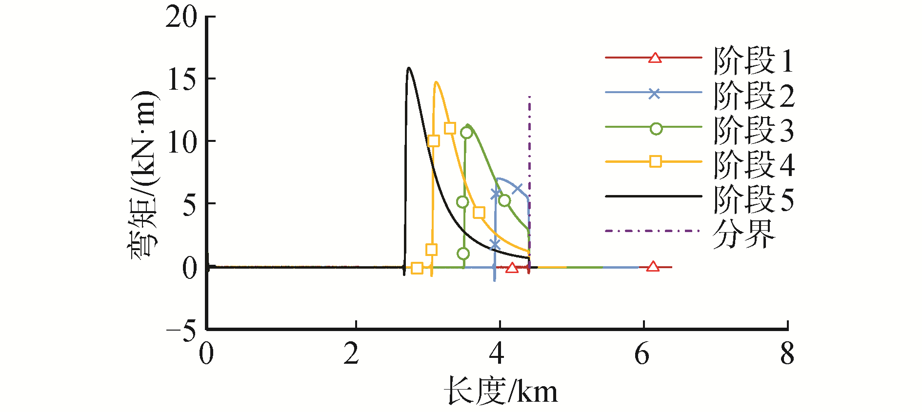 图 10为5个阶段下钢悬链线立管与A & R缆弯矩分布,表 6为各阶段下最大弯矩。其中分界线标志着钢悬链线立管与A & R缆的交点,在分界线左侧为钢悬链线立管段,右侧为A & R缆段,从图 10中可以看到,由于海床整体平整,钢悬链线立管基本不会弯曲,在海床上的钢悬链线立管所受弯矩作用约为零。在海床上的钢悬链线立管由于末端固定,末端处钢悬链线立管局部曲率较大,会产生较大的弯矩。A & R缆弯曲刚度在仿真中忽略不计,所以A & R缆不会产生弯矩。对比分析弯矩图可知在钢悬链线立管在触地点位置附近会产生最大弯矩,因为此时钢悬链线立管曲率达到最大。随着船舶向平台位置靠近,由于钢悬链线立管触底点与末端固定点距离逐渐缩短,触地点附近曲率逐渐增大,因此管道最大弯矩会越来越大,且最大弯矩位置向管道末端逐渐靠拢。钢悬链线立管在最终阶段时弯矩极值最高,最大值为15.82 kN·m。对同一作业阶段下的弯矩变化而言,在触地点附近时钢悬链线立管曲率达到最大,此时钢悬链线立管弯矩达到最大,在钢悬链线立管悬垂段曲率变化率逐渐减小。钢悬链线立管弯矩变化越来越缓慢,在到达与A & R缆连接处会减少为0。在第一阶段时,由于此时钢悬链线立管未被提升,所以没有像其他4个阶段在触地点产生大弯矩,在这个作业状态时的最大弯矩发生在钢悬链线立管末端固定端,弯矩最大值为1075 N·m。