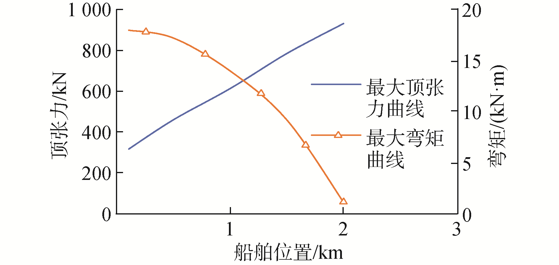 图 12为在钢悬链线立管舷侧安装不同阶段下,船舶舷侧位置最大顶张力以及钢悬链线立管最大弯矩变化曲线。如图 12所示,在整个作业过程中,随着钢悬链线立管的逐渐提升,船舶所受的顶张力在逐渐减小,而钢悬链线立管所承受的最大弯矩则是在逐渐增加。最大顶张力发生在作业船舶距平台2 000 m位置处,最大弯矩则发生在钢悬链线立管安装最终位置处,与静力学仿真结论一致。