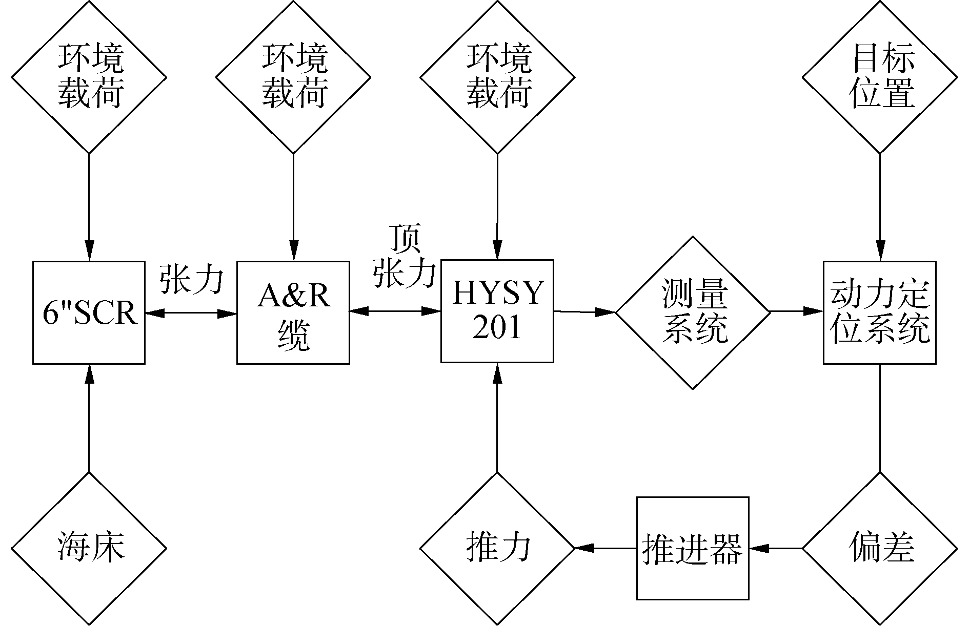 耦合仿真模型如图 3所示,主要由安装船“海洋石油201”、A & R缆、6”钢悬链线立管3部分组成,耦合模型中的各部分都受到环境载荷的作用,“海洋石油201”船与A & R缆通过A & R缆顶端张力作用相互拖动,在A & R缆与6”钢悬链线立管间存在张力作用,除此之外,6”钢悬链线立管触地段还受到海床支撑作用。当“海洋石油201”偏离目标位置时,动力定位系统计算当前位置与输入目标位置得到偏差,计算各推进器复位需提供的推力,推力作用于船舶,船舶运动位置改变,钢悬链线立管与A & R缆轴向张力随之改变,新的循环产生,为保证船舶定位于目标位置,该循环系统会持续工作。