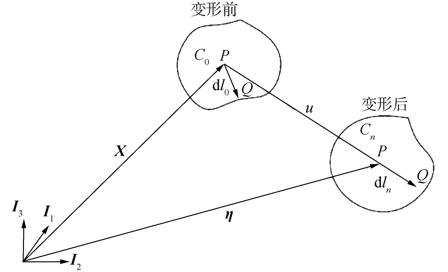 基于连续介质力学理论,采用有限元法建立钢悬链线立管与A & R缆相关理论模型。材料中微粒的运动可用拉格朗日方程表示,微小粒子在以基向量Ii定义的坐标系中运动如图 5所示[13]。