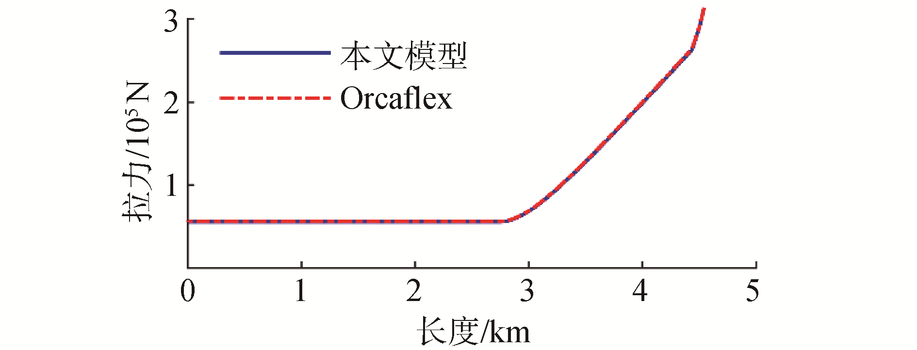 为了验证模型建立的准确性,以第5阶段为例,将本文计算的结果与商用软件Orcaflex计算结果进行了对比,对比静态结果如图 6、图 7所示,可以看出钢悬链线立管与A & R缆的轴向拉力分布与弯矩分布几乎没有差异。为进一步验证模型准确性,本文模型所计算的A & R缆顶张力时历结果也需要与Orcaflex结果进行对比,考虑到Orcaflex没有动力定位模块,无法进行全耦合模型仿真,故将本文模型所得船舶六自由度作为Orcaflex输入参数,确保运动状态一致,顶张力时历对比结果如图 8所示,对比结果基本一致,得以验证本文所用仿真模型准确性。