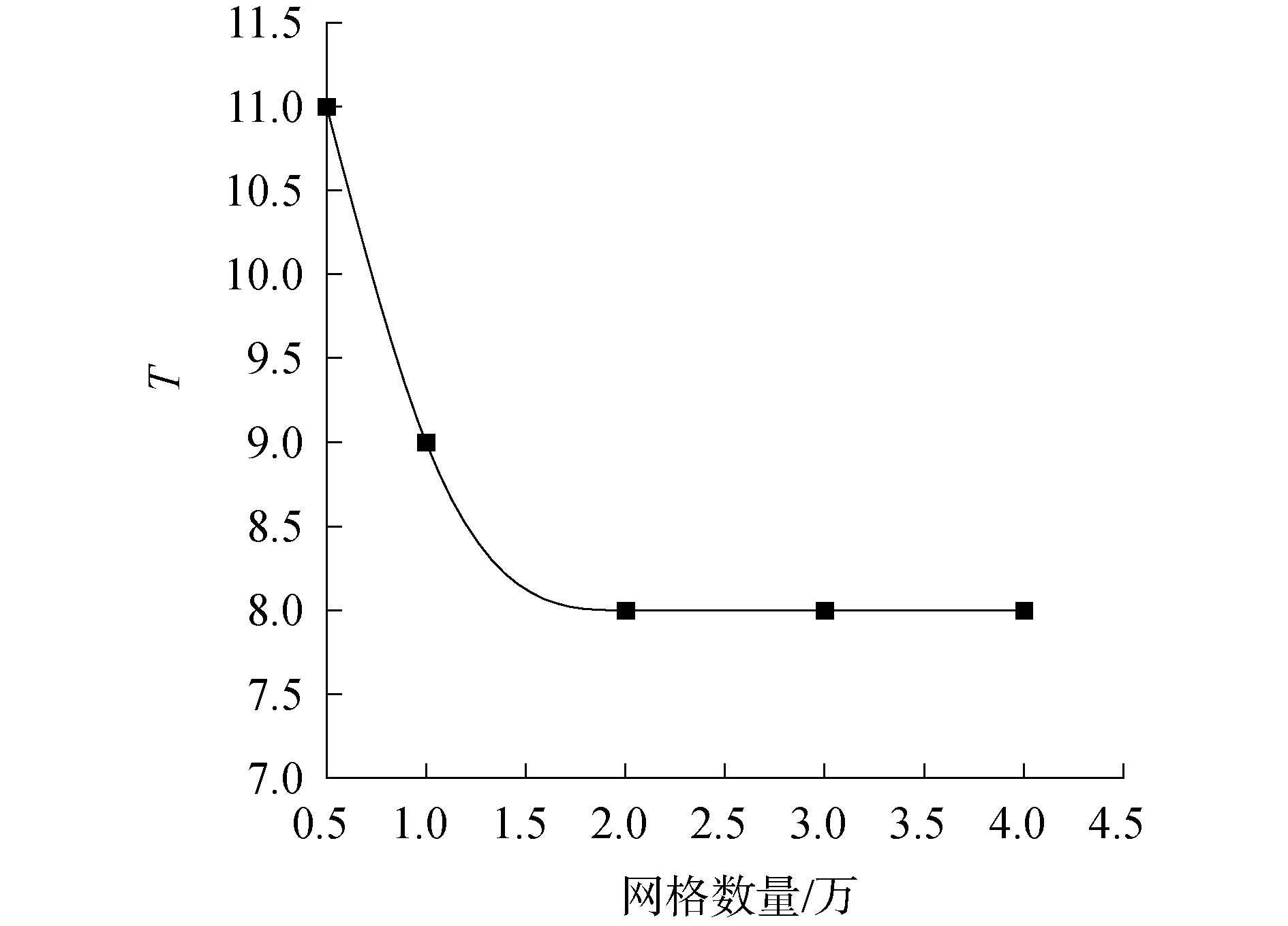 表 1 工作流体的物性参数Table 1 Physical property parameters of working fluid工作流体 工作温度范围/K 选择工作温度/K 密度/(kg·m-3) 粘度/(Pa·s) 表面张力/(N·s) 硅油 275~335 300 1 081.5 0.005 0.039 986 锂 453~540 500 504.83 0.000 54 0.393 锡 505~1 000 680 683 0 0.001 58 0.005 18 在模拟过程中,设置工作流体和空气作为两相并采用层流模型,对液滴进行初始化来设置液滴与壁面的初始相对位置和相对速度的大小,用液滴入射速度方向的不同来表示壁面与竖直方向倾斜角度的不同。设置液滴的初始位置在截面中央,用面网格剖分在截面上划分四边形二维网格,设置底边为出口,其余三条边为壁面。网格正交比为1,倾斜度最大为1.306 6×10-10,最小为1.305 7×10-10,单元最大内角均为90°。进行网格无关性检验,使用液滴达到最大铺展系数所需要的无量纲时间作为检验条件,设置硅油液滴直径为100 μm,以10 m/s的速度液滴竖直撞击壁面,时间步长为10-7 s,结果如图 3所示。30 000的网格量与20 000的网格量相比,网格数量增加了50%,但无量纲时间相同,并且从20 000之后,再增加网格数量,无量纲时间也基本不发生变化。因此,选择20 000的网格数量作为模拟用的网格标准。对于离散方法的选择,考虑到求解速度、稳定性、精度等方面的因素,采用双精度进行计算,压力速度耦合采用非迭代算法(pressure-implicit with splitting of operators, PISO),使用预压交错选项(PRESTO方法)离散压力,对动量和能量方程使用二阶迎风格式求解,瞬态方程的离散采用一阶迎风格式求解,容积比率方程采用几何重构方法求解,计算中取时间步长为10-7 s。最后,用CFD-post观察演化过程,对结果进行分析。用雷诺数描述液滴撞击的过程,雷诺数Re=ρuD/μ表示粘性流体流动时惯性力和粘滞力的比值,大的惯性力和小的粘滞力有利于空间环境下液滴的收集,因此在进行液滴收集器的设计时,应选择雷诺数较大的情况。