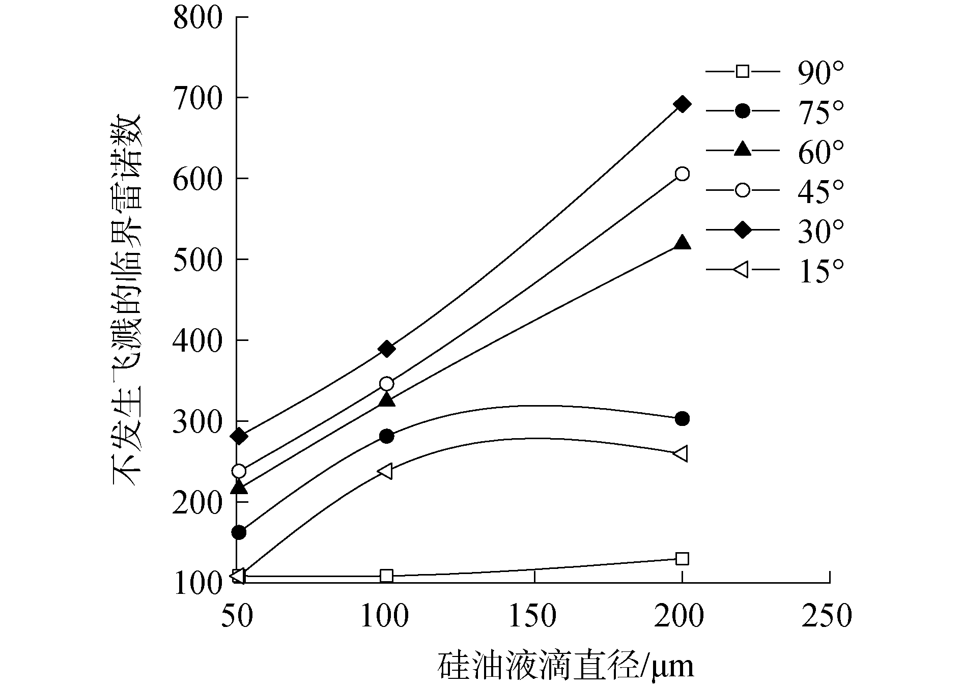 1) 对于直径分别分50、100和200 μm的硅油液滴,在壁面与竖直方向夹角相同的条件下,液滴不发生飞溅的临界雷诺数随着液滴直径的增大而增大。