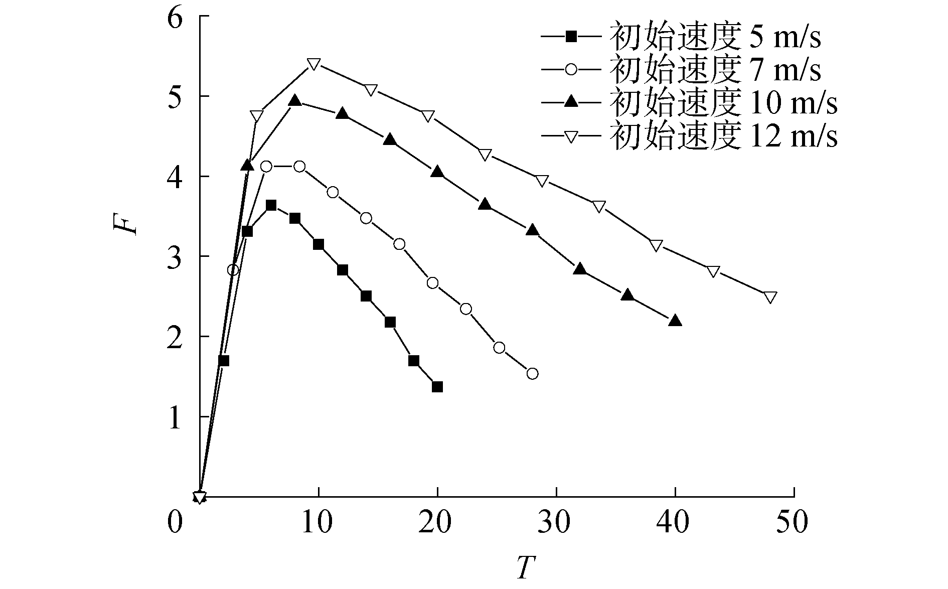 本文探究不同速度的硅油液滴撞击壁面变化。控制硅油液滴直径为100 μm,速度大小分别为5、7、10和12 m/s,速度方向沿x轴负方向,等效于撞击水平壁面,计算区域为400 μm×800 μm的长方形区域,液滴初始位于区域中央。铺展系数F定义为液滴在壁面上铺展距离Ds与液滴直径D的比值,无量纲时间T定义为液滴速度大小u与时间t的乘积与液滴直径D的比值。作出不同碰撞速度下液滴的铺展系数F随无量纲时间T的变化曲线,如图 6所示。