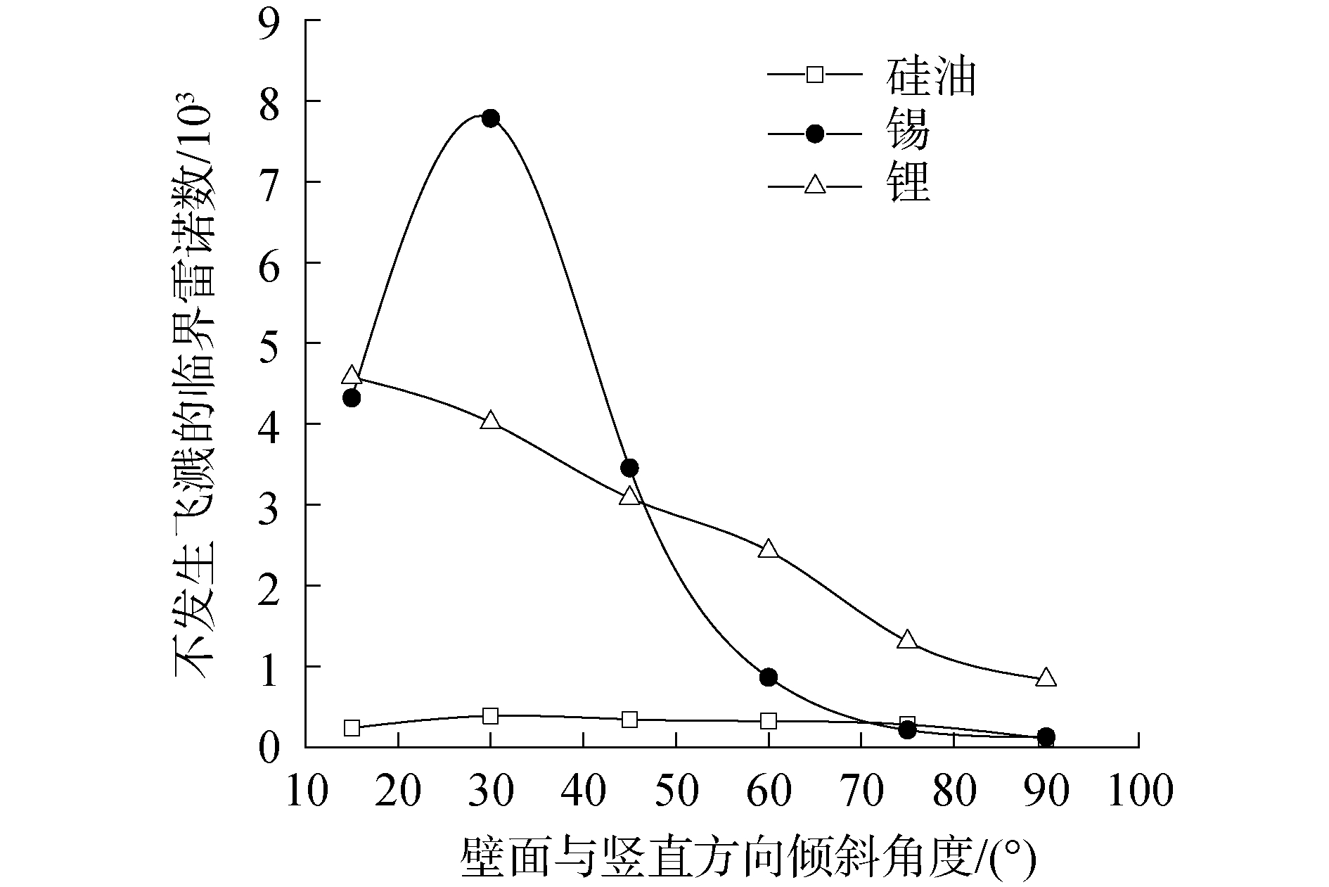4) 对于工作流体硅油和锡,随着壁面与竖直方向倾斜角度的增加,液滴不发生飞溅的临界雷诺数先增大,在倾斜角度为30°时达到最大值,然后随着倾斜角度的增加,临界雷诺数会减小,并且锡的临界雷诺数变化幅度更大;对于工作流体锂,不发生飞溅的临界雷诺数随着壁面倾斜的增大单调减小,在15°时临界雷诺数为最大值。