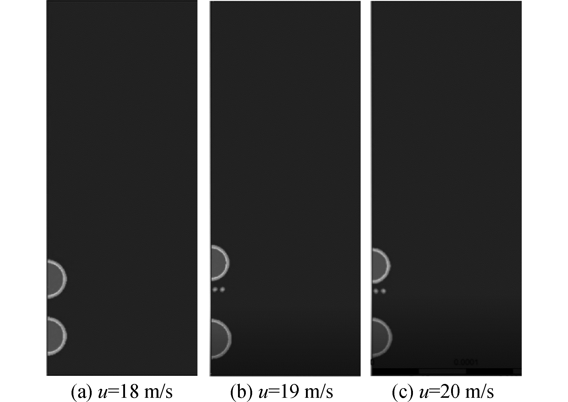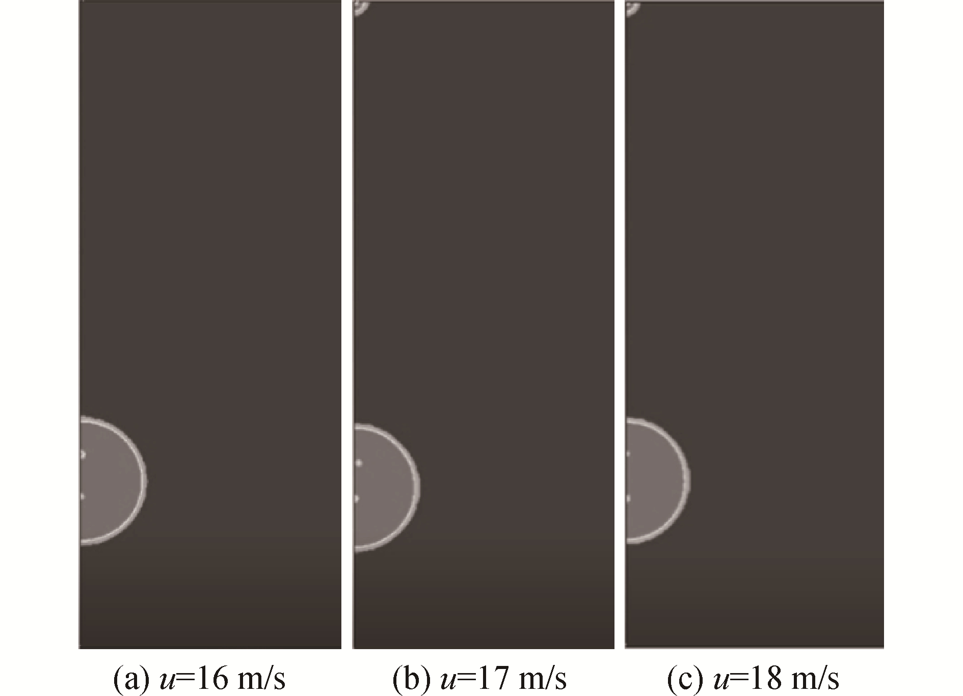 从图 7可以看出,对于工作流体硅油和锡,随着壁面与竖直方向倾斜角度的增加,液滴不发生飞溅的临界雷诺数先增大,在倾斜角度为30°时达到最大值,分别为389.34和7 781.01,然后随着壁面与竖直方向倾斜角度的增加,临界雷诺数会减小,并且锡的临界雷诺数变化幅度更大;对于工作流体锂,不发生飞溅的临界雷诺数随倾斜角度增大单调减小,在15°时临界雷诺数为最大值4 580.86。锂与其他2种流体的曲线特点不同主要是因为锂的粘度为0.000 54 Pa ·s,约硅油粘度1/10, 锡粘度的3/10,而锂的表面张力为0.393 kg/m3,约为硅油的10倍,锡的76倍,当液滴和与竖直方向夹角较小的壁面碰撞时,锂液滴能够全部从出口流出而不飞溅黏附在壁面上,其他2种流体容易黏附。壁面倾斜角度在15°~45°时,3种工质的临界雷诺数都比较大,选择这个角度内的倾斜壁面更有利于液滴收集。在液滴种类、直径相同,壁面倾斜角度一定时,当速度增大到一定值,液滴会发生飞溅, 因为液滴的碰撞速度越大, 冲击动能越大, 较大的冲击动能能够克服液滴的表面张力作用,脱离原来的液滴吸附在壁面上,此时再增大速度会导致飞溅更容易发生。图 8、9为确定液滴不发生飞溅的临界速度的过程,图 8(a)~(c)是100 μm硅油液滴以不同速度撞击30°倾斜壁面,图中可以看到,当u=18 m/s时,撞击后没有发生飞溅,当速度增大到u=19 m/s时,有2部分液体从左边壁面飞溅,不能聚合成液滴,无法进行收集,造成工质的损失。u=20 m/s的结果与u=19 m/s的结果相同,因此临界速度为18 m/s。图 9(a)~(c)是100 μm硅油液滴以不同速度撞击45°倾斜壁面,图中可以看到,当u=16 m/s时,撞击后不发生飞溅,当u=17 m/s时,有一部分液滴飞溅到上壁面,u=18 m/s时与u=17 m/s结果相同,因此临界速度为16 m/s。根据Re=ρuD/μ进一步算出临界雷诺数。