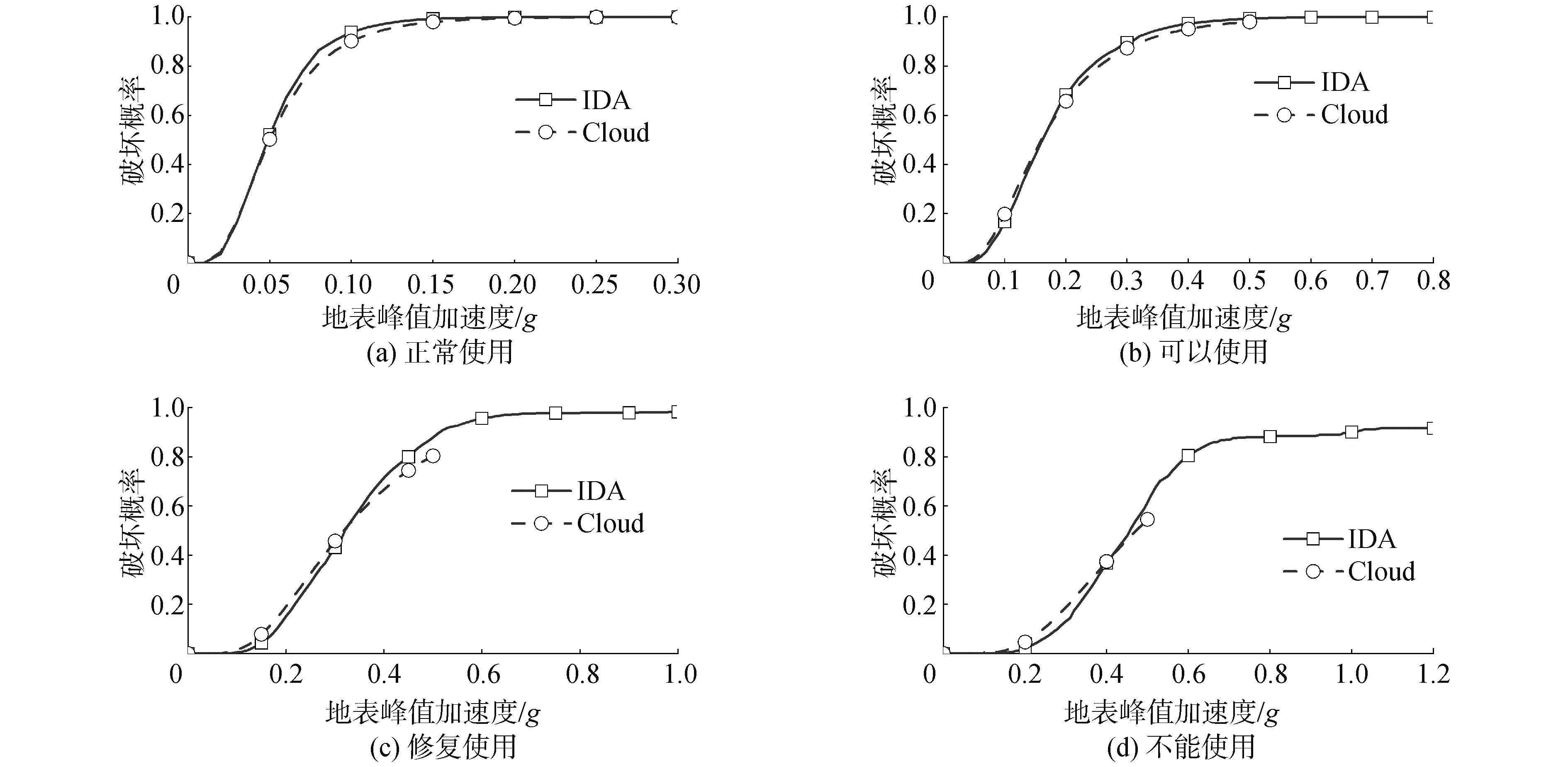 $$ \ln (\text { IDR })=1.06 \ln (\text { PGA })+0.6 $$ (5) 如图 6所示, 图中黑色散点为基于IDA方法计算结果, 红色散点为基于云图法计算结果, 所对应的黑实线与红实线分别为基于IDA方法与云图法的数据回归所得。由图 6可以发现, 黑色实线与红色实线具有很高的重合度, 这说明基于IDA方法与云图法所得到的$\hat{\theta}_{\mathrm{IDR}}-I_{\mathrm{PGA}}$对数线性回归模型基本一致。此外, 基于IDA方法所得到的$\hat{\theta}_{\mathrm{IDR}}$标准差为0.35, 而基于云图法所得到的$\hat{\theta}_{\mathrm{IDR}}$标准差为0.49, 这说明基于2种方法所得到的$\hat{\theta}_{\mathrm{IDR}}$离散性具有一定的差异性。进一步观察图 6可以发现, 基于云图法所得到的红色散点相当数量分布于地震动强度相对较小的区域, 而在高强度地震动坐标仅有少数样本数据, 相比于云图法, IDA方法所得到的数据样本分布则相对均匀。这主要归因于2种方法基于不同地震记录输人的结果, 后续地震易损性曲线的对比研究将对该问题作进一步阐述。