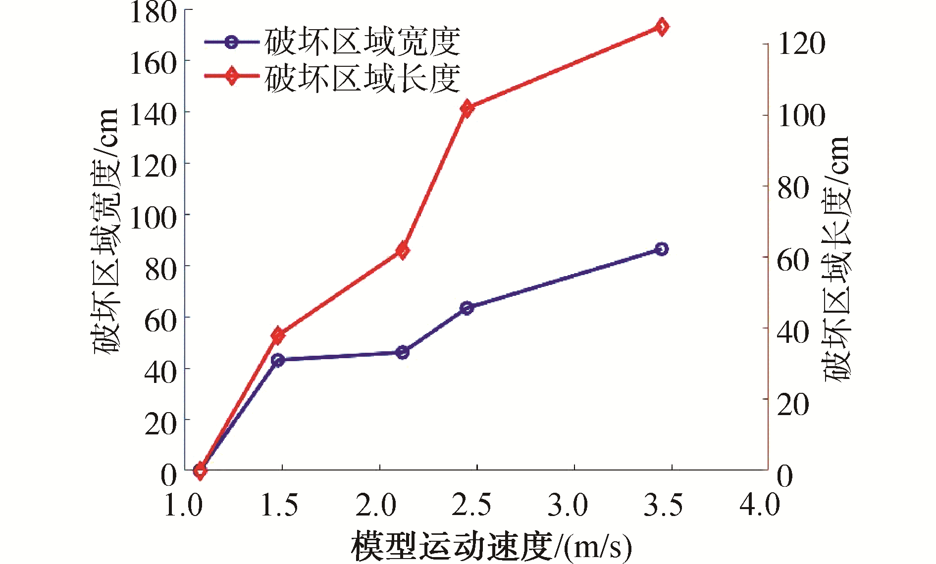 在V增长至2.45 m/s之前,随着V的增大冰面破坏程度迅速增大;在V从2.45 m/s增至3.45 m/s的阶段,冰面破坏程度随模型运动速度的增加而增大的趋势明显放缓。该趋势与前文冰层增阻效应的变化趋势一致。