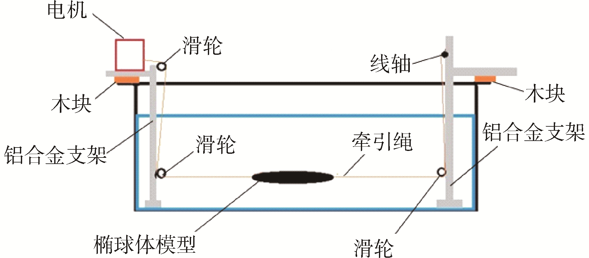 图 2是实验装置示意图。选定无级变速电机作为动力输出装置,椭球体模型的两端分别通过牵引绳连接电机的转轴与水池另一端的线轴。该线轴可沿自身中轴线顺畅转动,且轴上预先缠绕较长的牵引绳,电机旋转时将椭球体前端的牵引绳绕收到电机轴上,椭球体后端的牵引绳不断从线轴上被扯出持续变长,由此实现了椭球体模型的前进。而处于水面下的2个定滑轮限定了牵引绳的走向,起到了限制模型垂直方向位移的作用,确保模型在运动时其浸没深度不会变化。