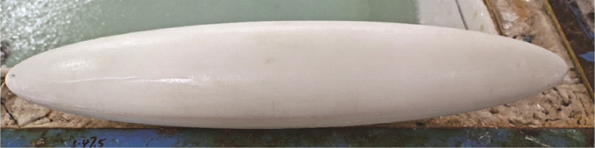 椭球体模型利用3-D打印技术加工,加工材料选用具有防水性的树脂塑料。模型设计成可拆卸的2部分,模型的厚度维持在5~10 mm内,其内部留有较大空腔,以便后期填塞配重来保证模型稳定漂浮于水中。椭球体模型见图 3,长L=350 mm,最大直径D=80 mm。