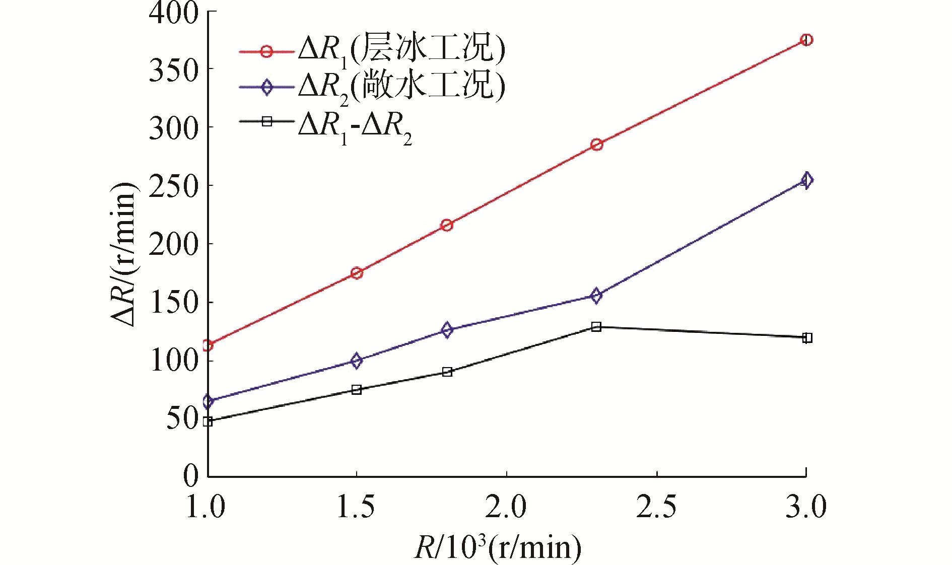 在1~30组次的试验结果中,以模型浸没深度为11 cm的工况为例,分别测定层冰工况与敞水工况电机转速的差值,所得数据如表 2所示。以电机设定转速为横坐标,电机转速差为纵坐标,将表 2数据绘制为折线图,如图 5所示。分别以ΔR1、ΔR2表示层冰工况与敞水工况下电机设定转速减去实际转速的差值。第3条曲线ΔR1-ΔR2为层冰工况电机转速差与敞水工况电机转速差的差值曲线,该数值的大小反映了相较于敞水工况,由于冰层导致的模型拖航阻力增加量。