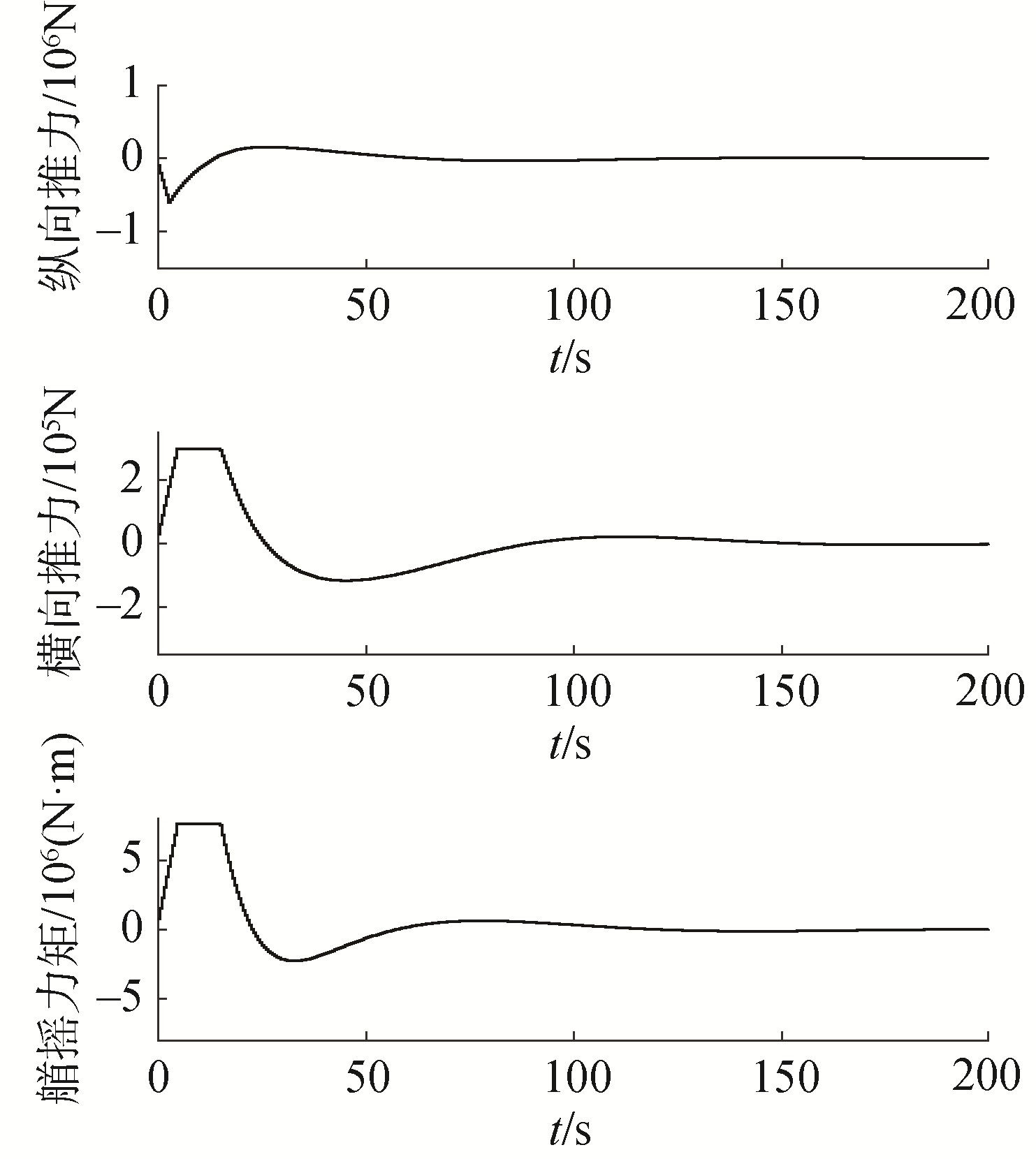 图 4~6是船舶受定常扰动时的位置状态、速度状态和推力与推力力矩的响应曲线。定常扰动大小为d=[1×104 N 3×103 N 7×104 N·m]T,分别表示船舶纵向、横向和艏摇方向上的扰动力及扰动力矩。从图 4~6中可以看出,即使船舶受到一定扰动,NMPC控制器依然能够控制船舶达到稳定状态,稳定时间大约为160 s。与无扰动时相比,稳定时间没有显著增加,船舶最终稳定的位置状态与参考状态存在一定偏差,但偏差极小。这说明本文设计的NMPC控制器具有一定的本质鲁棒性。