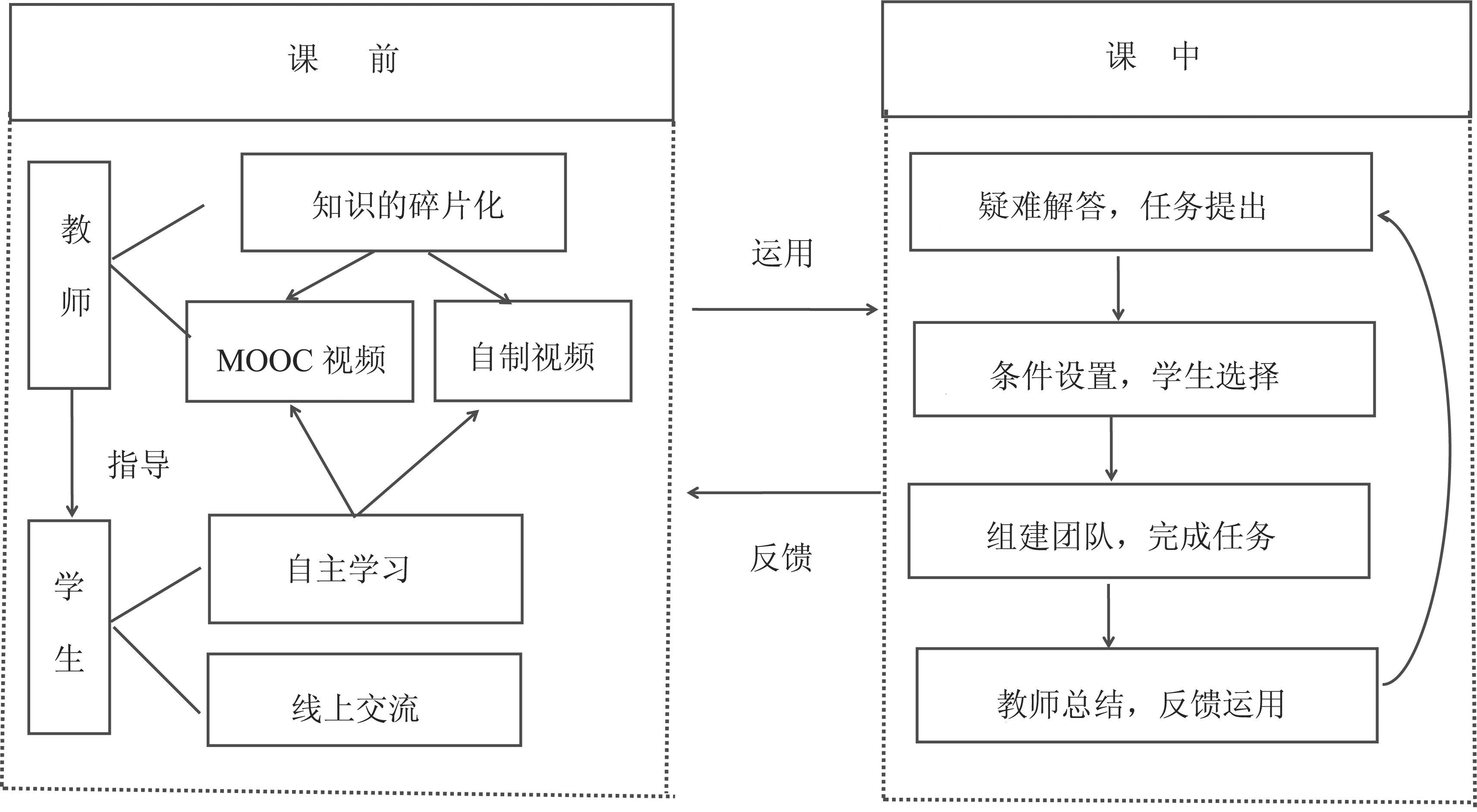 3. 教学形式上的耦合性如果仅从教学的形式上来看,MOOC可以看作是翻转课堂的课前,即MOOC是翻转课堂的一部分,翻转课堂是MOOC的延伸。[6]MOOC的视频观看、习题训练、章节测试都是可以安排在翻转课堂课前完成的内容,然后教师再根据学生在线上的学习进度、知识掌握程度到线下的实体课堂进行答疑、一对一的指导、安排课堂互动活动。MOOC和翻转课堂的这种联系对教师来讲是非常有优势的,教师可以将自己制作的优质教学视频上传到MOOC平台,供更广阔的受众观看;或者可以直接引用他人的优秀视频资料,集中精力进行课堂教学设计或科研建设。
