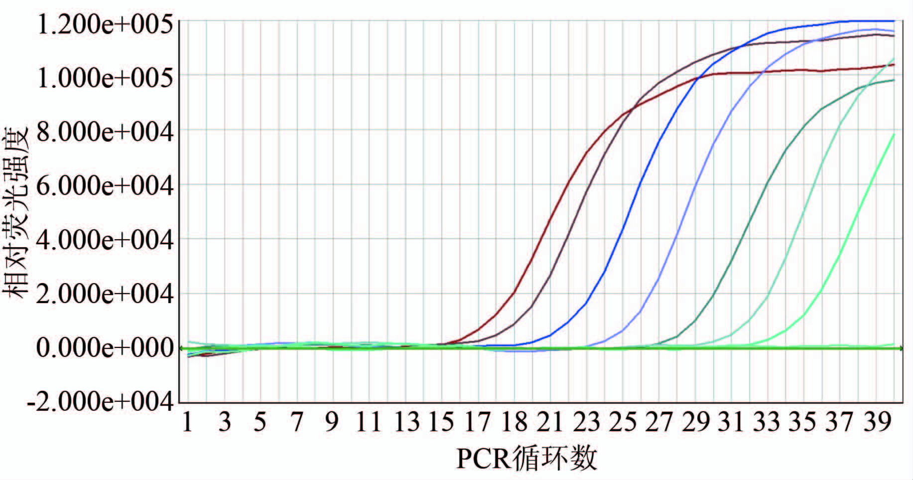 Figure 1 Evaluation on detection limit of real-time RT-PCR nbsp; 注:real-time RT-PCR检测轮状病毒系列稀释液,从左至右,依次为原液、10-1~10-6稀释度扩增曲线。
