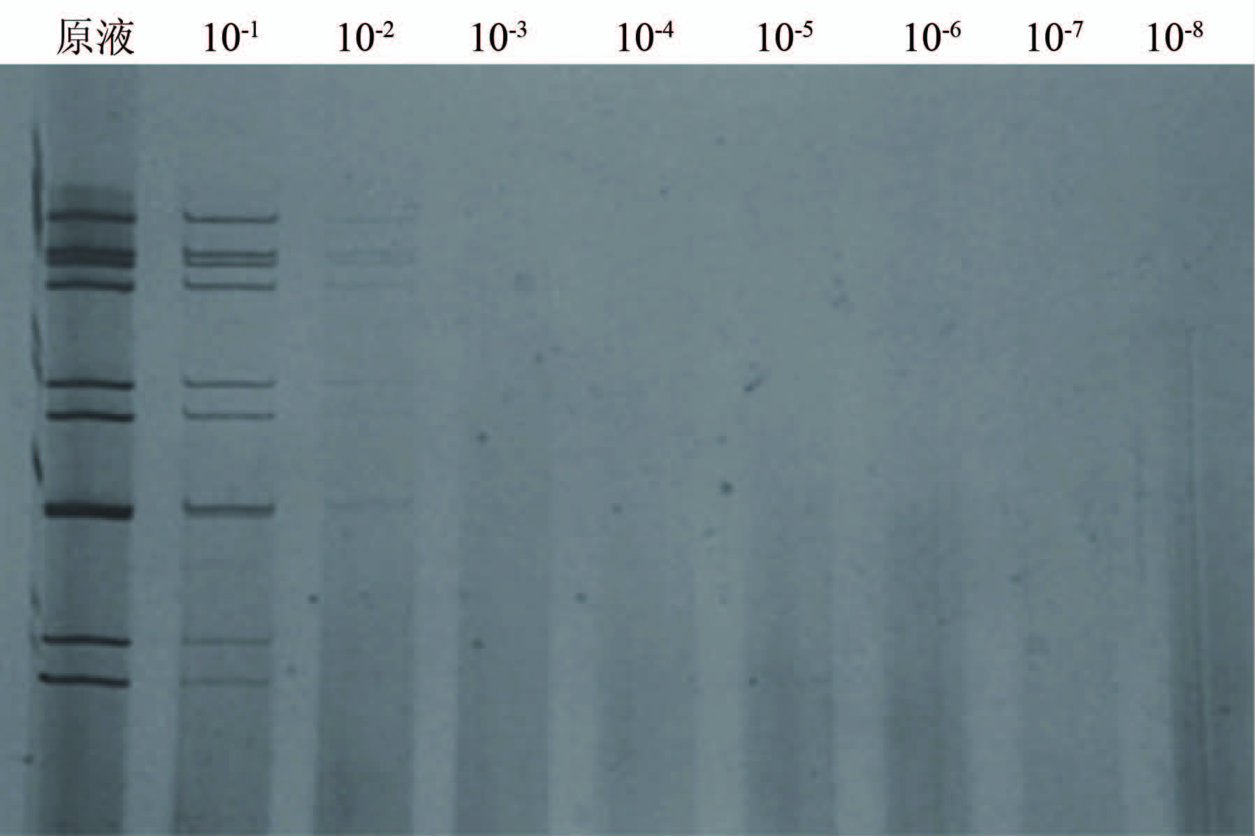 Figure 2 Evaluation on detection limit of PAGE 注: PAGE检测轮状病毒系列稀释液,从左至右9条泳道依次对应原液、10-1~10-8稀释度。