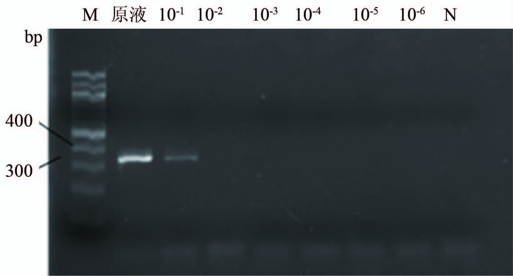 Figure 3 Evaluation on detection limit of RT-PCR 注:RT-PCR检测轮状病毒系列稀释液,从左至右10条泳道依次对应分子质量标准、病毒原液、病毒10-1~10-6稀释液和阴性对照。