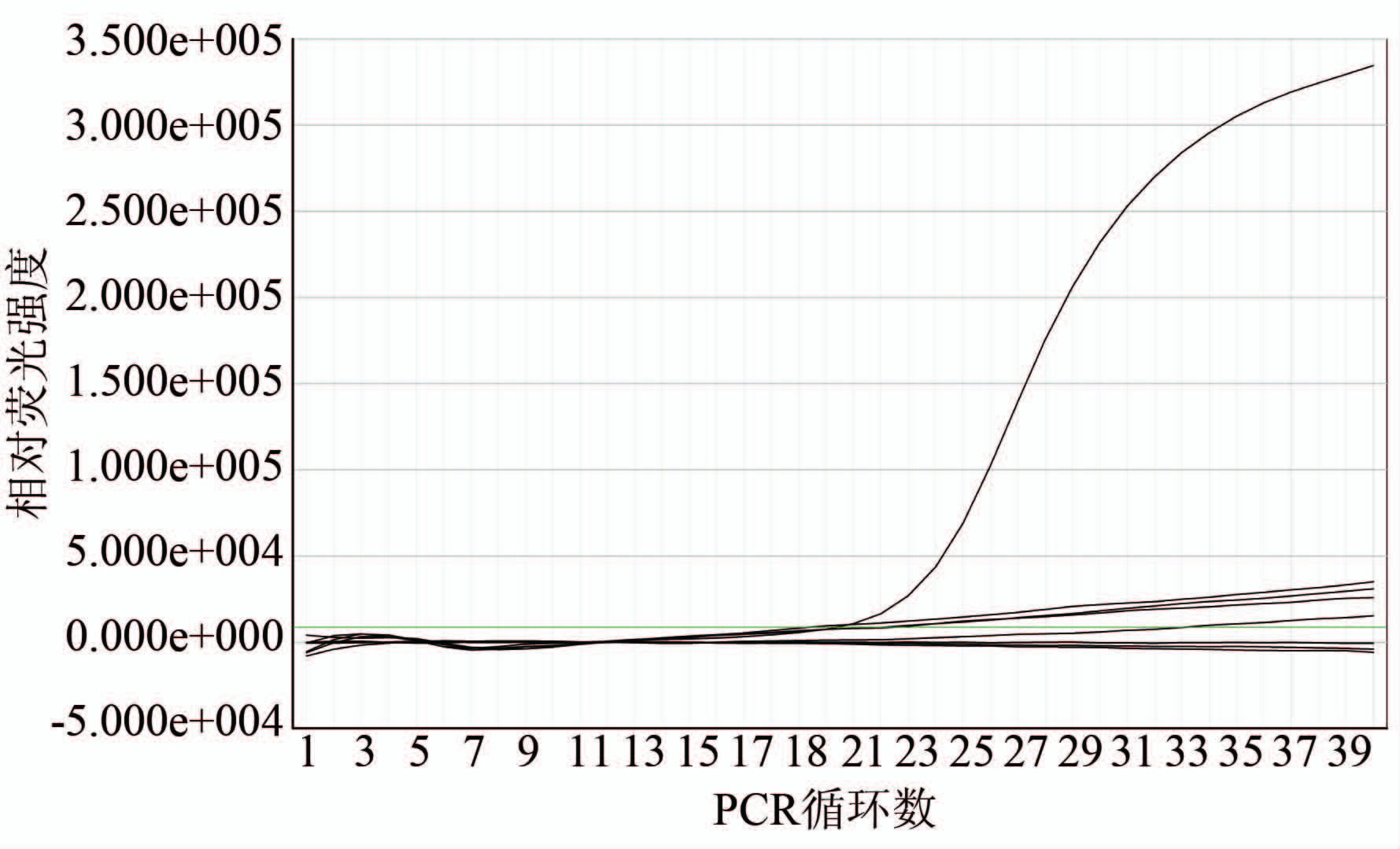 Figure 4 Evaluation on specificity of real time RT-PCR 注:图中阳性扩增曲线为轮状病毒扩增曲线,9种对照病原体扩增均为阴性。