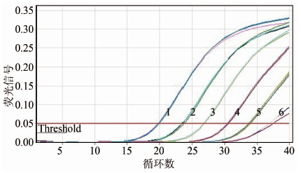 图 1 armA基因阳性质粒标准品荧光信号图 Figuer 1 Fluorescent graph of armA-positive standard plasmid 注:1~6分别为4.07×106~4.07×101拷贝/ml阳性质粒(空白对照图中未显示)