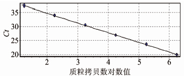 图 2armA基因的质粒拷贝数对数值及其对应Ct值的标准曲线 Figuer 2 Standard curve of armA-positive standard plasmid